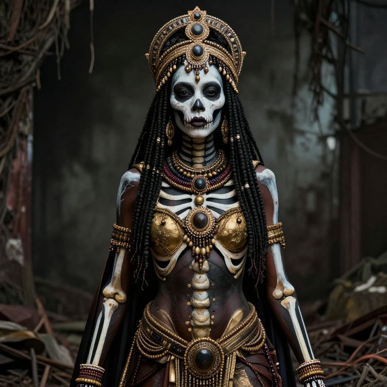 A hyperrealistic, intricately detailed African voodoo priestess with a Baron Samedi skeleton painted on her body, wearing elaborate dark and gold attire with beaded accessories, stands in a gritty, grimdark environment.