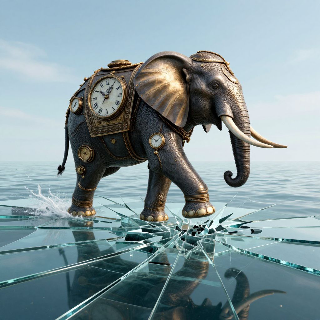 In a surreal 3D-rendered scene, a clockwork elephant adorned with ornate Roman numeral timepieces strides gracefully across a fractured glass ocean, its every step seamlessly repairing the shattered surface below, blending steampunk aesthetics with high-definition realism.