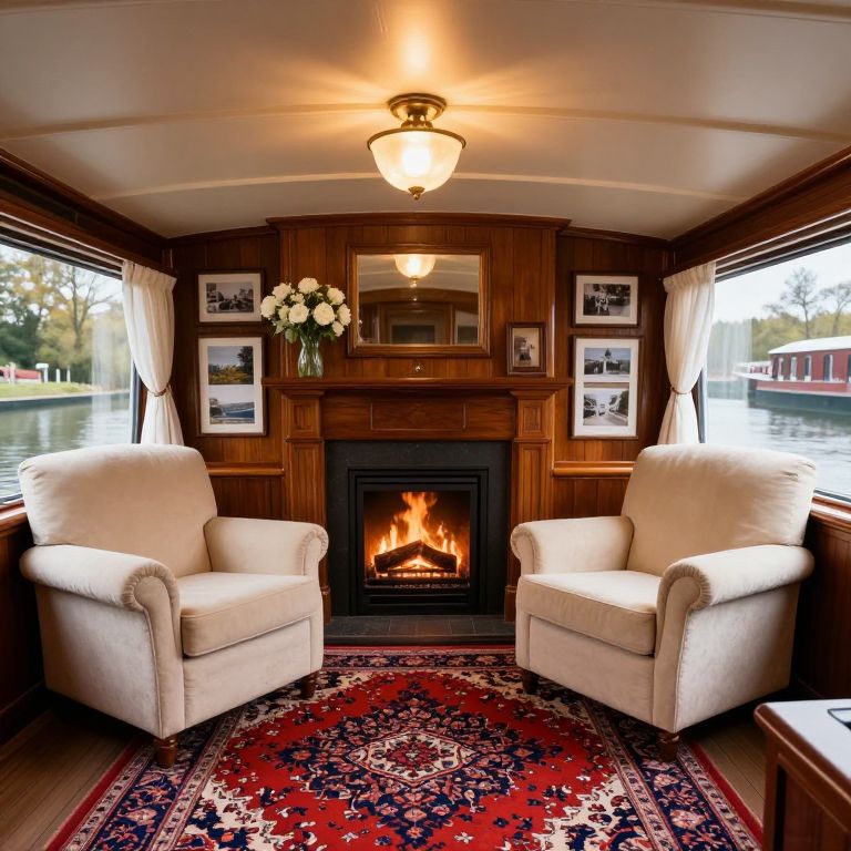 Cozy living room aboard a charming canal boat, featuring two cream armchairs flanking a vibrant Persian rug, a roaring fireplace with a vase of white flowers atop its mantel, framed photographs adorning the wooden walls, and large windows draped with sheer curtains, all illuminated by a warm pendant light hanging from a coffered ceiling.