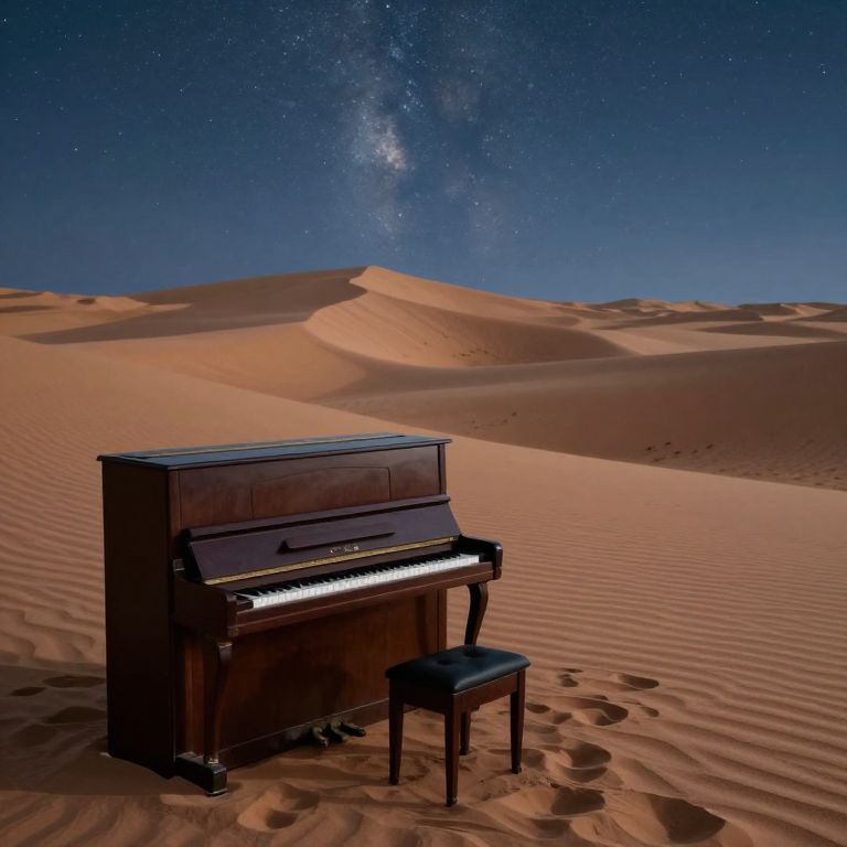Amidst the vast expanse of the desert, a piano emerges from the shifting sands, its keys poised to play nocturnes under the starlit sky, embodying the silent longing of solitude and the timeless yearning for connection.