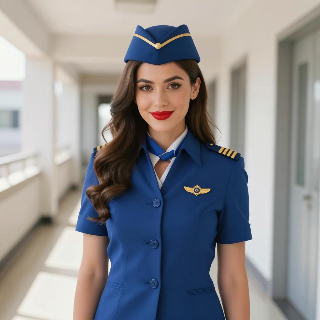 Air hostess costume blue, photorealistic portrait of a beautiful woman, long wavy brown hair, wearing a blue pilot uniform with a matching cap, red lipstick, smiling, standing in a sunlit hallway, blurred background, bright colors, high detail, female pilot, confident expression, uniform buttons visible, soft lighting, model looking directly at camera