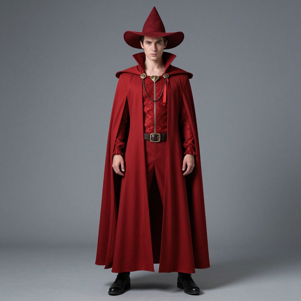 Sorceress Man Costume, man in a red cape and hat with a red cape