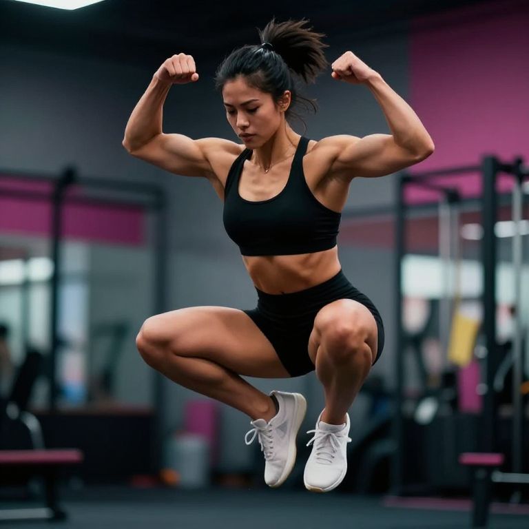 Dynamic scene of a pretty female bodybuilder mid-jump during training session, powerful muscles flexed, background blurred to signify motion, vibrant colors and high contrast, expression of strength and agility, cinematic and motivational artwork