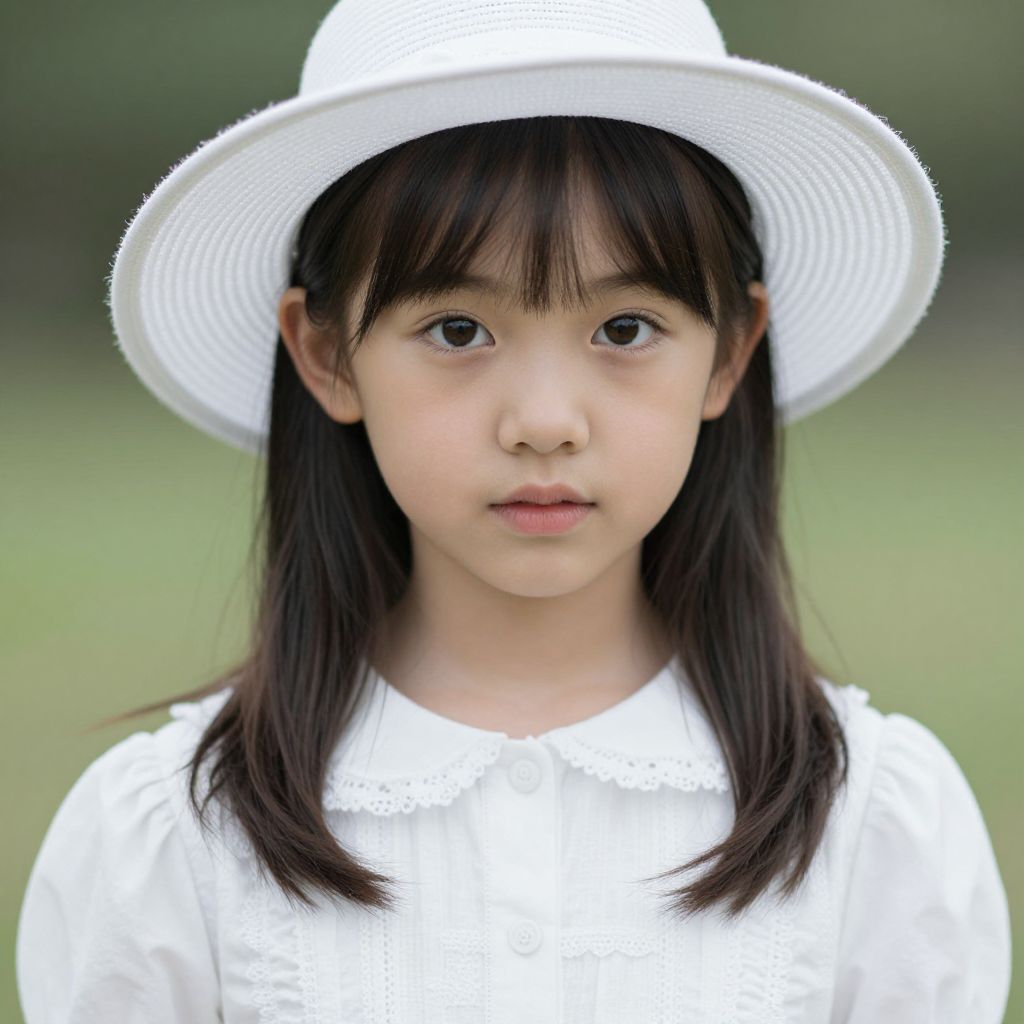 This is a photograph of an Asian girl with fair skin and straight, dark brown hair that falls to her shoulders. She has large, dark brown eyes and a small, round nose. She is wearing a white, wide-brimmed sun hat and a white, long-sleeved blouse with subtle, textured patterns. The background is blurred with green hues, suggesting an outdoor setting. Her expression is neutral, and the lighting is natural, highlighting her youthful features. The image has a soft focus, emphasizing her face and hat, while the background remains indistinct.