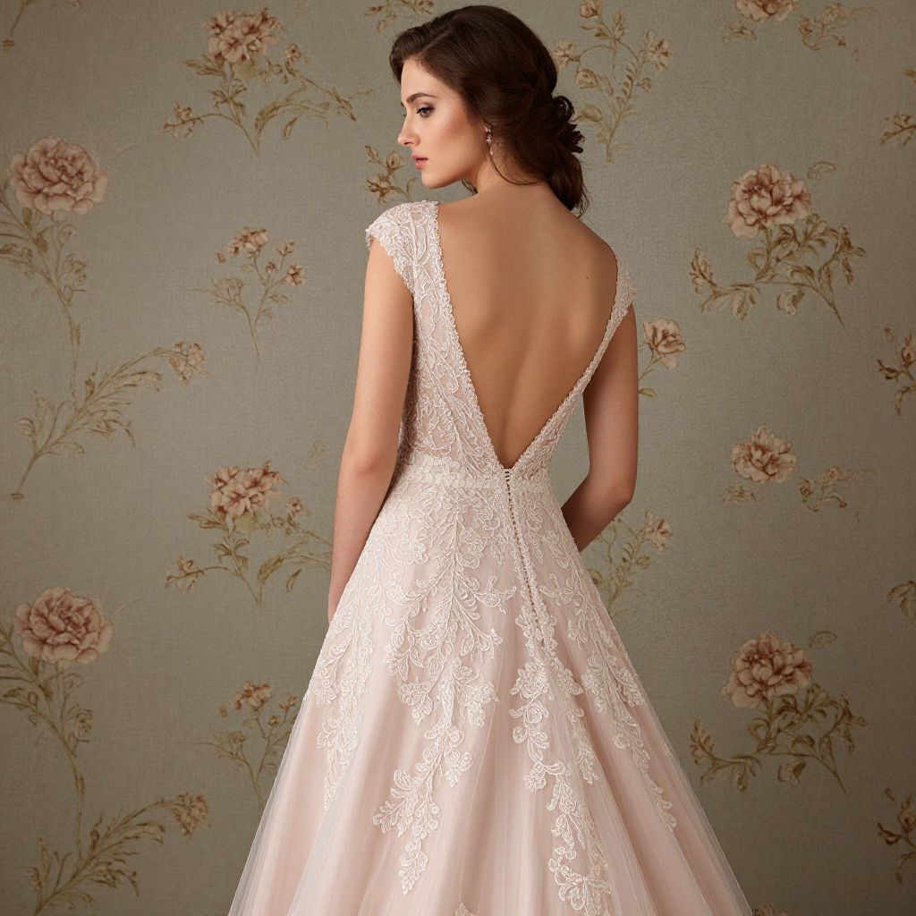 A woman elegantly showcases a blush pink wedding dress with intricate lace detailing and a deep V-back, set against a vintage-inspired floral wallpaper backdrop, creating a romantic and timeless visual effect.