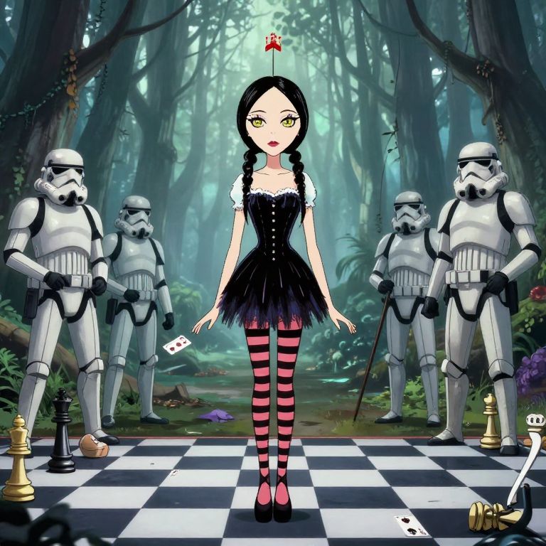 Cap Height wednesday addams in chess dress and striped stocking playing cards with storm troopers in misty forest anime style,