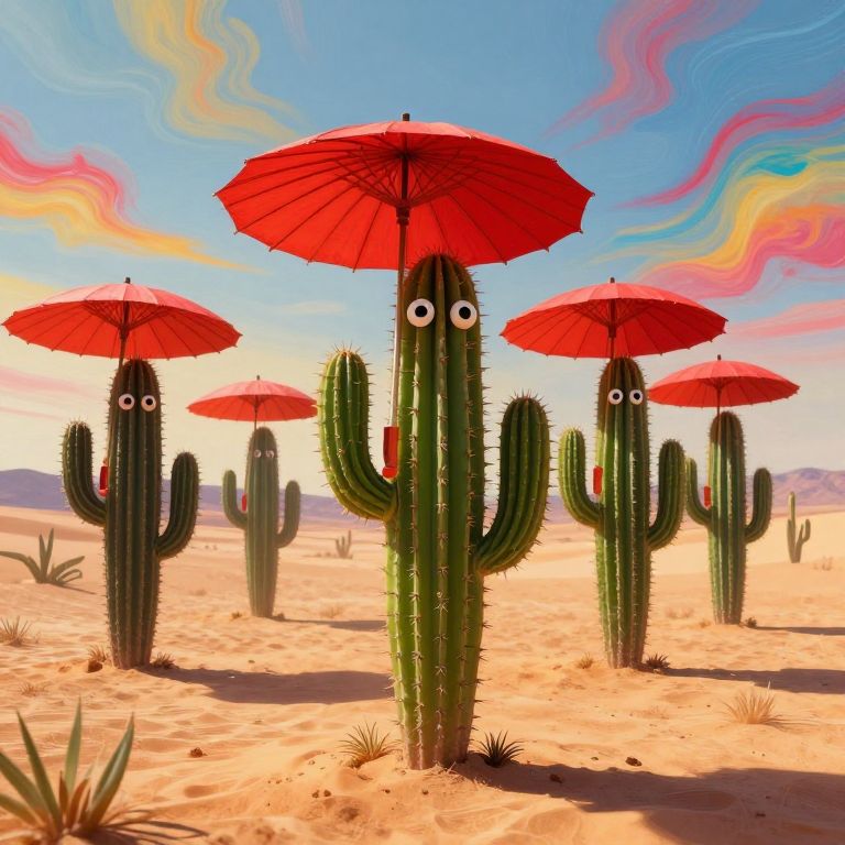 A whimsical procession of anthropomorphic cacti stands tall in a desert landscape, each adorned with expressive eyes and holding delicate red parasols, defying the harsh sun beneath a sky awash with swirling, painterly hues.
