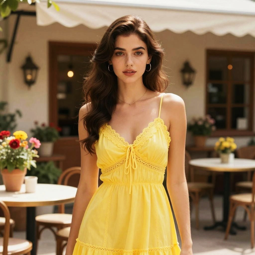 A svelte woman in a bright yellow sundress with lace trim, v-neckline, and spaghetti straps, stands at a charming café in a courtyard, surrounded by vibrant flowers and rustic decor, in the style of image comics. Sexy. Pretty face and beutiful eyes