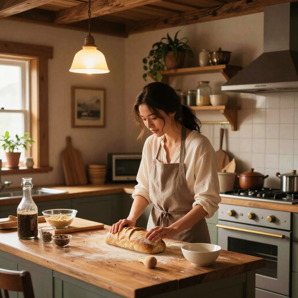 Vicky in a cozy rustic cabin kitchen, baking fresh bread surrounded by warm wooden textures and soft glowing lamps, vintage decor with plants on shelves, a peaceful homey vibe, warm color palette, detailed interior scene