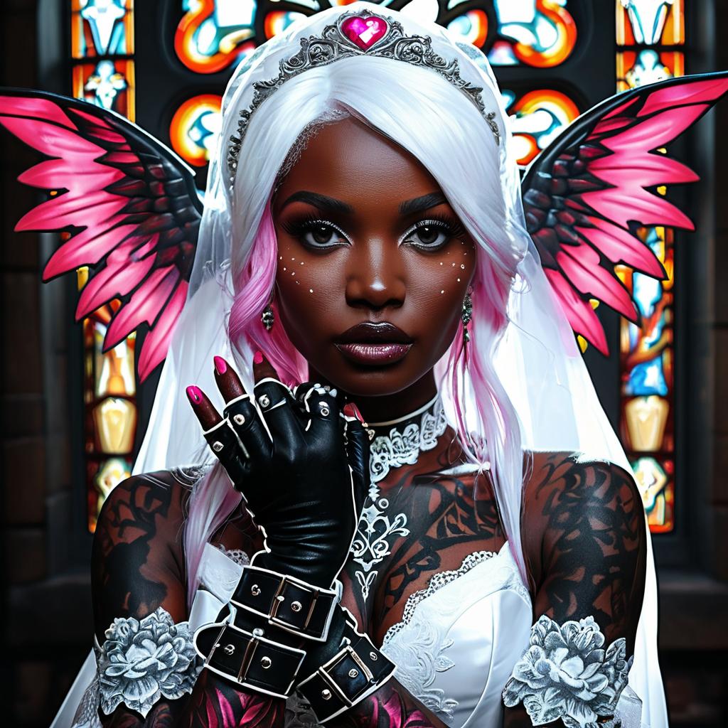 This photograph features a dark-skinned woman with long, flowing hair that transitions from silver to pink. She is playing a grand piano adorned with sheet music. She wears an off-the-shoulder, gold-embellished dress with a pink, tulle skirt. The background showcases an opulent room with white marble walls, gold candelabras, and framed paintings. The lighting is dramatic, highlighting her silhouette against the brightly lit background. The image has a high-contrast, almost ethereal quality, emphasizing the elegance and beauty of the scene.