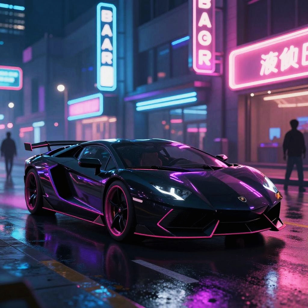 A digital artwork of a sleek, black sports car with neon pink and purple accents parked on a shiny, wet city street at night. Bright, colorful neon signs in blue, pink, and white illuminate the background, creating a cyberpunk vibe. The car's aggressive stance and reflective surface add a dynamic feel to the scene. Silhouetted figures walk in the distance.