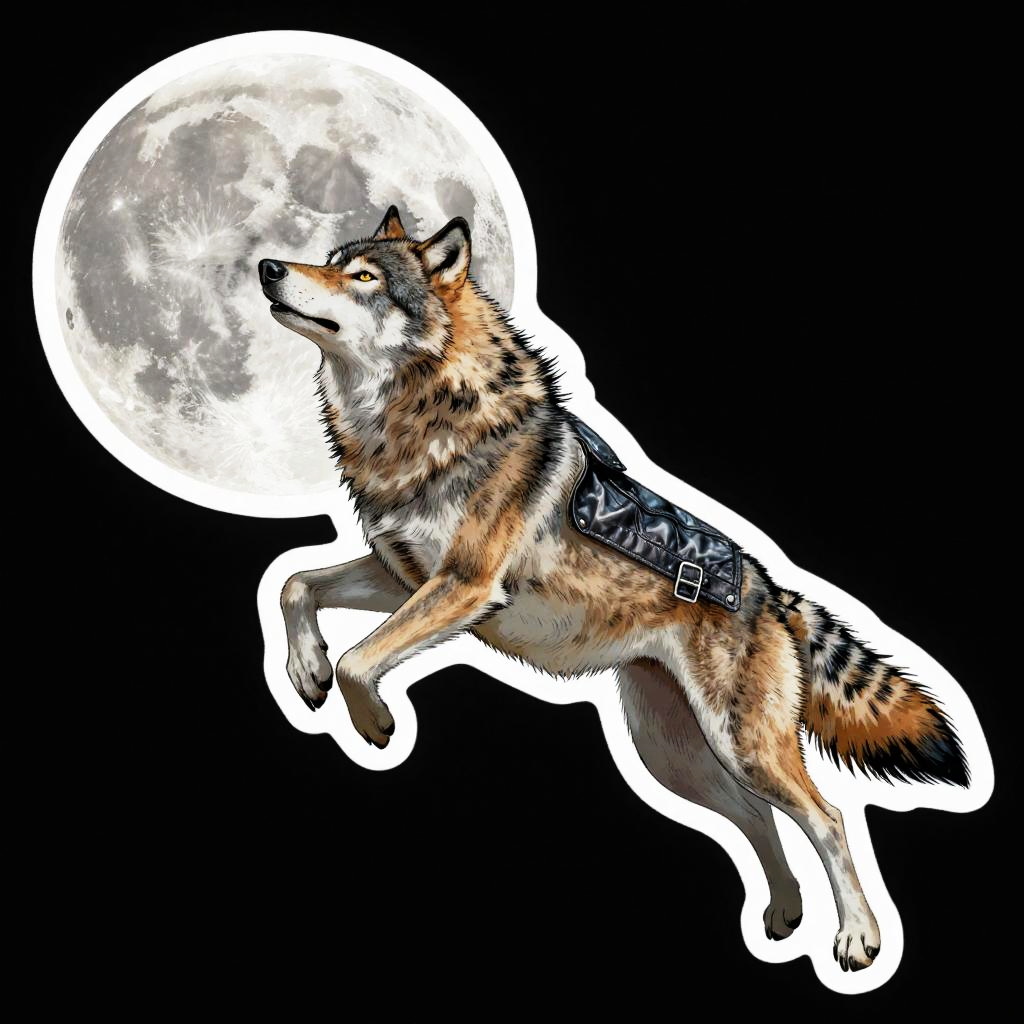 Die cut sticker of a wolf leaping to catch a moon wearing a leather jacket