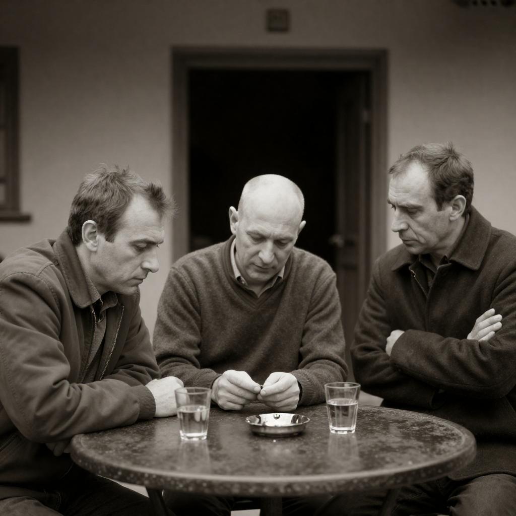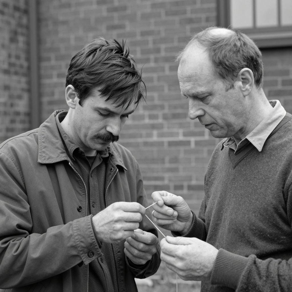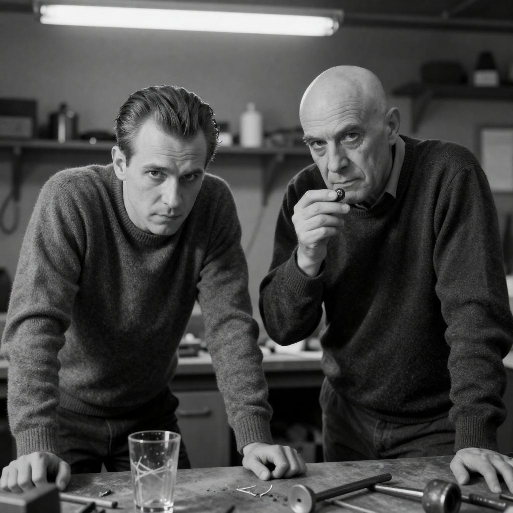 Black and white photograph of two middle-aged men in a cluttered workshop. The younger man with slicked-back hair and a serious expression leans forward, while the older bald man with a stern expression holds a small object near his mouth. Both wear thick, dark sweaters. A broken glass and tools are on the table in the foreground.