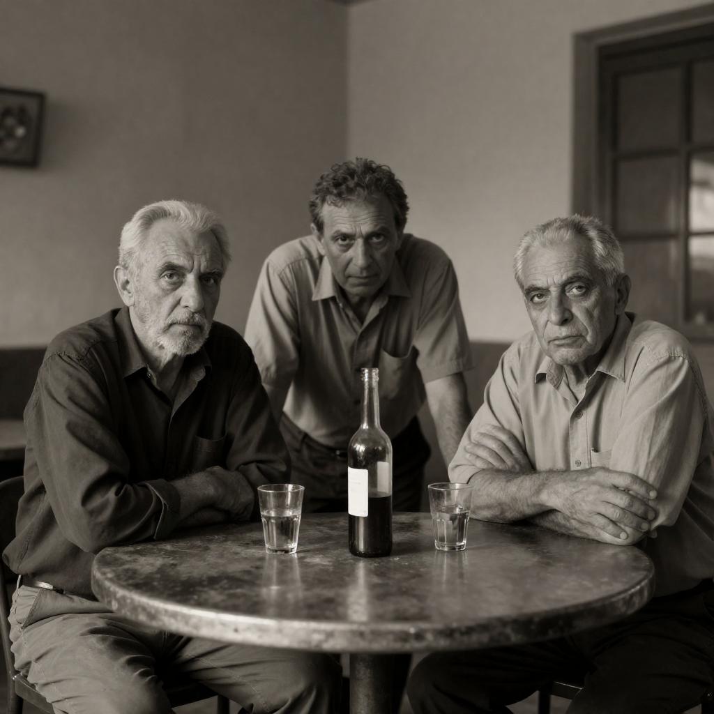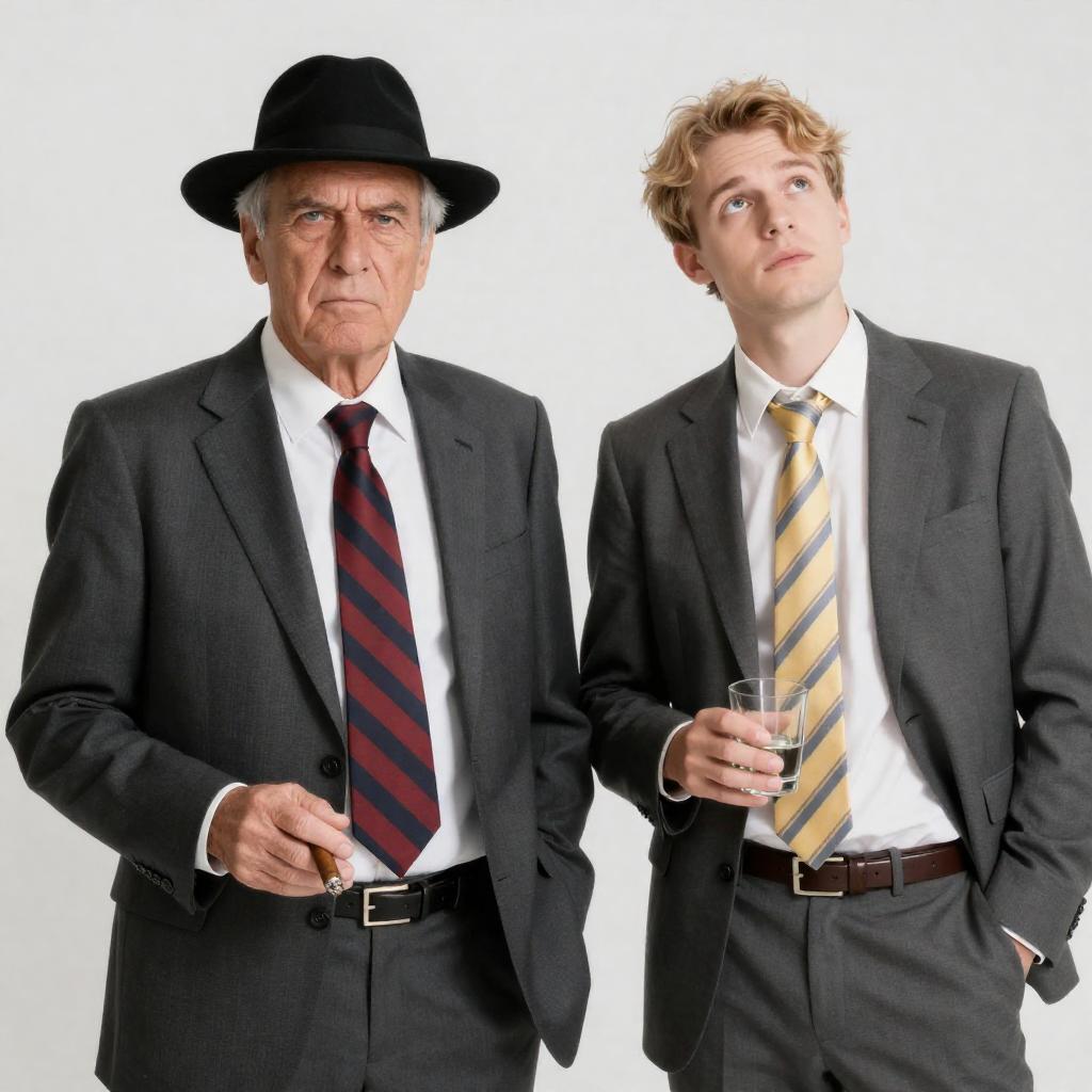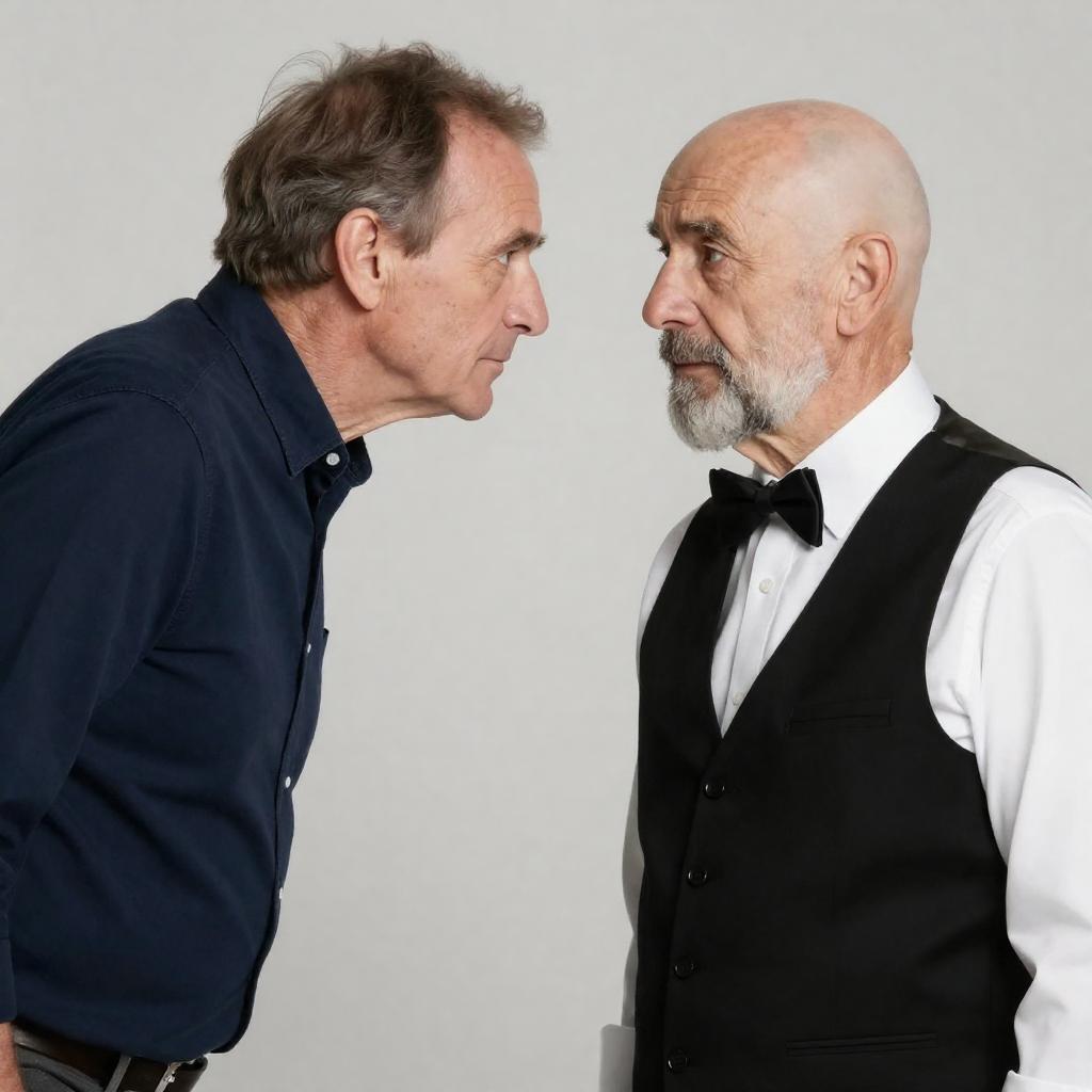 Black and white photograph of two middle-aged men in a cluttered workshop. The younger man with slicked-back hair and a serious expression leans forward, while the older bald man with a stern expression holds a small object near his mouth. Both wear thick, dark sweaters. A broken glass and tools are on the table in the foreground.