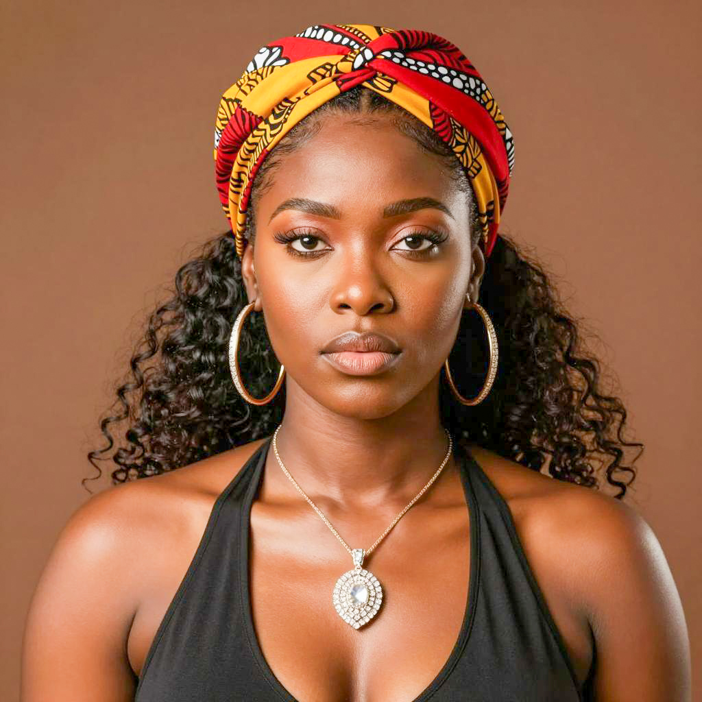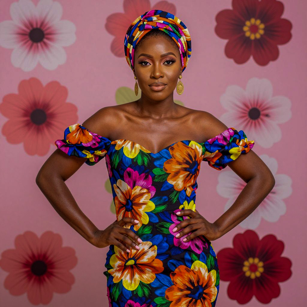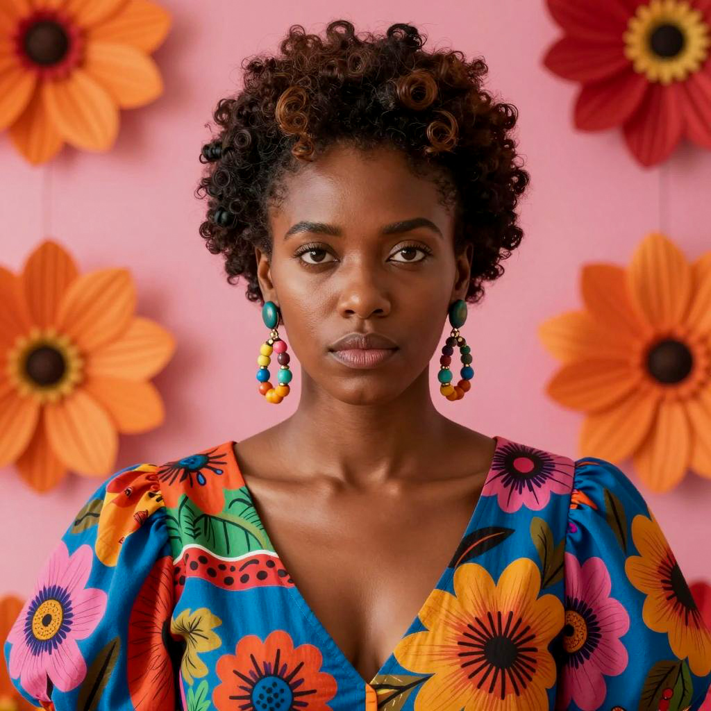 Photograph of a woman with medium brown skin, brown eyes, and full lips. She wears a bright orange headwrap with colorful floral patterns, matching earrings, and a colorful floral blouse with pink, blue, and white flowers. Pink flowers with green leaves in the background. Her gaze is direct and intense. She is centered, facing forward.