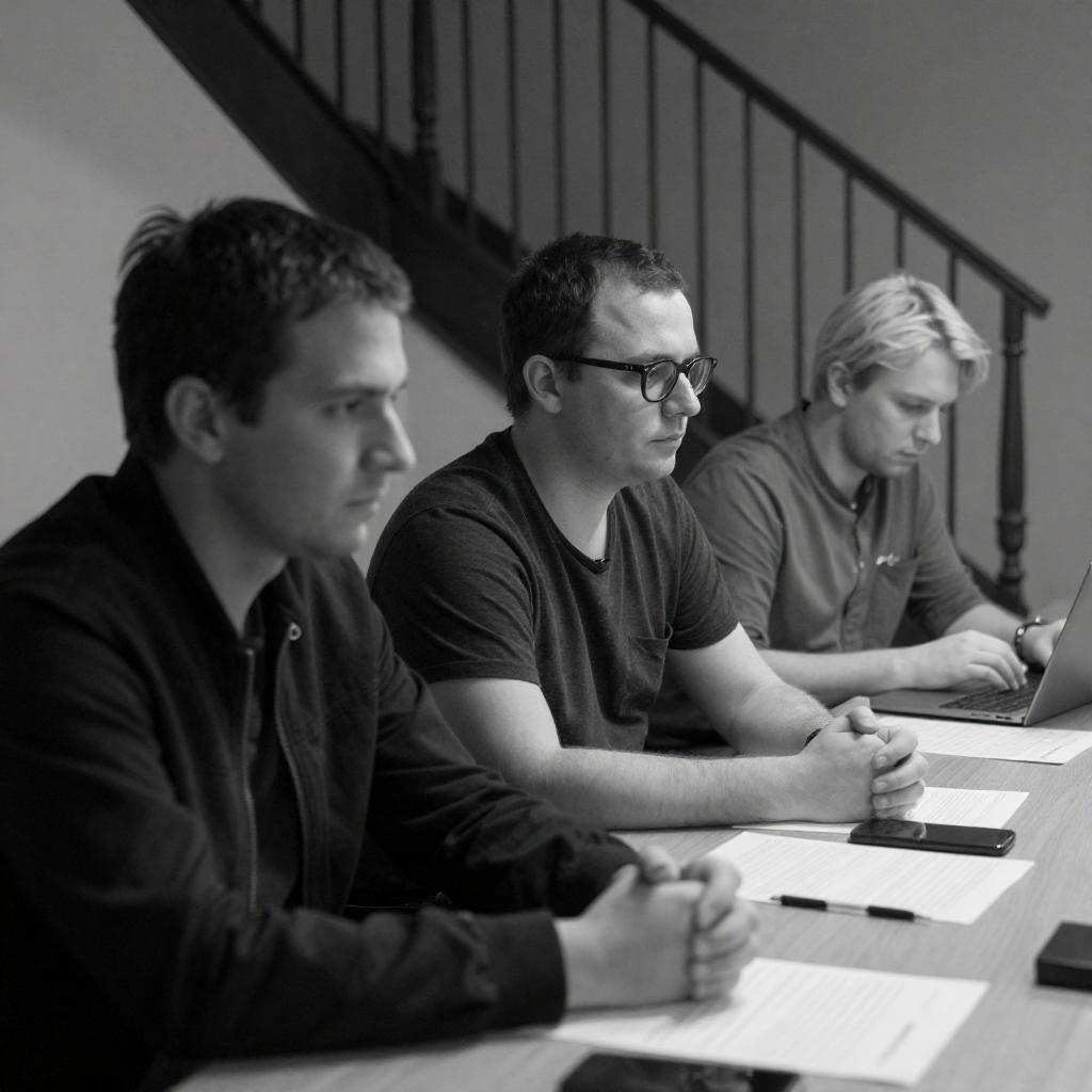 Black and white photograph. Three men sitting at a table in a dimly lit room. Foreground man with dark hair, intense expression, wearing dark jacket. Center man with glasses, calm expression, hands clasped. Background man with blonde hair, focused on laptop. Stairs with railing in background. Table has papers, pen, and phone.