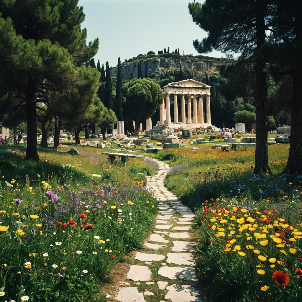 Vfx fantastical, small meadow in the center of the town center, colorful flowers, picnicking families, joyful, warm, mystical, fairytale, photography, realistic, surrounding greenery, nearby path leading to Greek ancient forum, Classical Greek architecture off to the left side and massive forest to the right, oversized objects, incorrect proportions, above average scale size