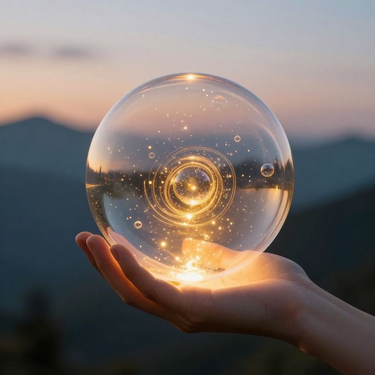 A hand cradles a luminous bubble that radiates golden light and contains a miniature universe of swirling particles and floating bubbles, defying gravity against a twilight mountain backdrop.