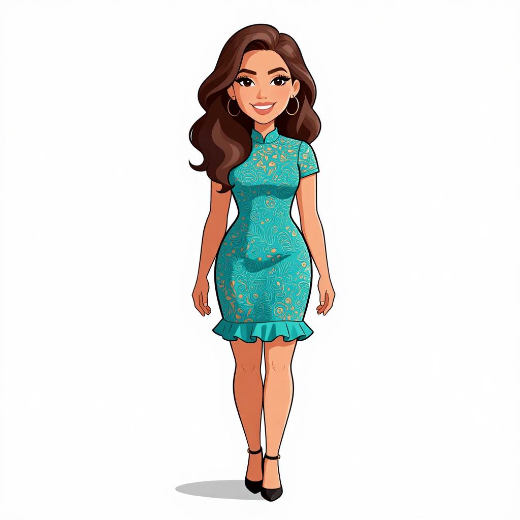 This digital drawing in a cartoon style features a smiling woman with long, wavy brown hair and fair skin. She wears a teal, short-sleeved, form-fitting dress with intricate gold floral patterns and a ruffled hem. Her outfit is paired with black high-heeled shoes. She has large hoop earrings and a confident stance, with one hand relaxed by her side and the other slightly raised. The background is plain white, making her the focal point of the image. The artwork uses bold, vibrant colors and clean lines, typical of modern digital cartoon illustrations.