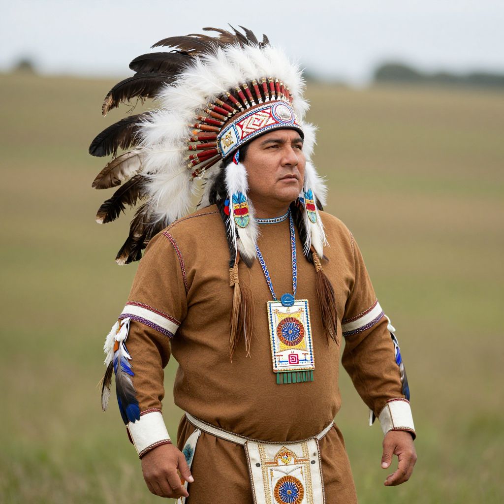 Photograph of a Native American man standing in a grassy field. He has medium brown skin and wears a large, ornate headdress with white, black, and red feathers. His brown traditional tunic is adorned with white and blue arm bands and a beaded necklace with a colorful badge. A white belt with intricate embroidery is tied around his waist. His expression is serious, and the background is a blurred, open field with a cloudy sky. The image has a vibrant, slightly saturated color palette.