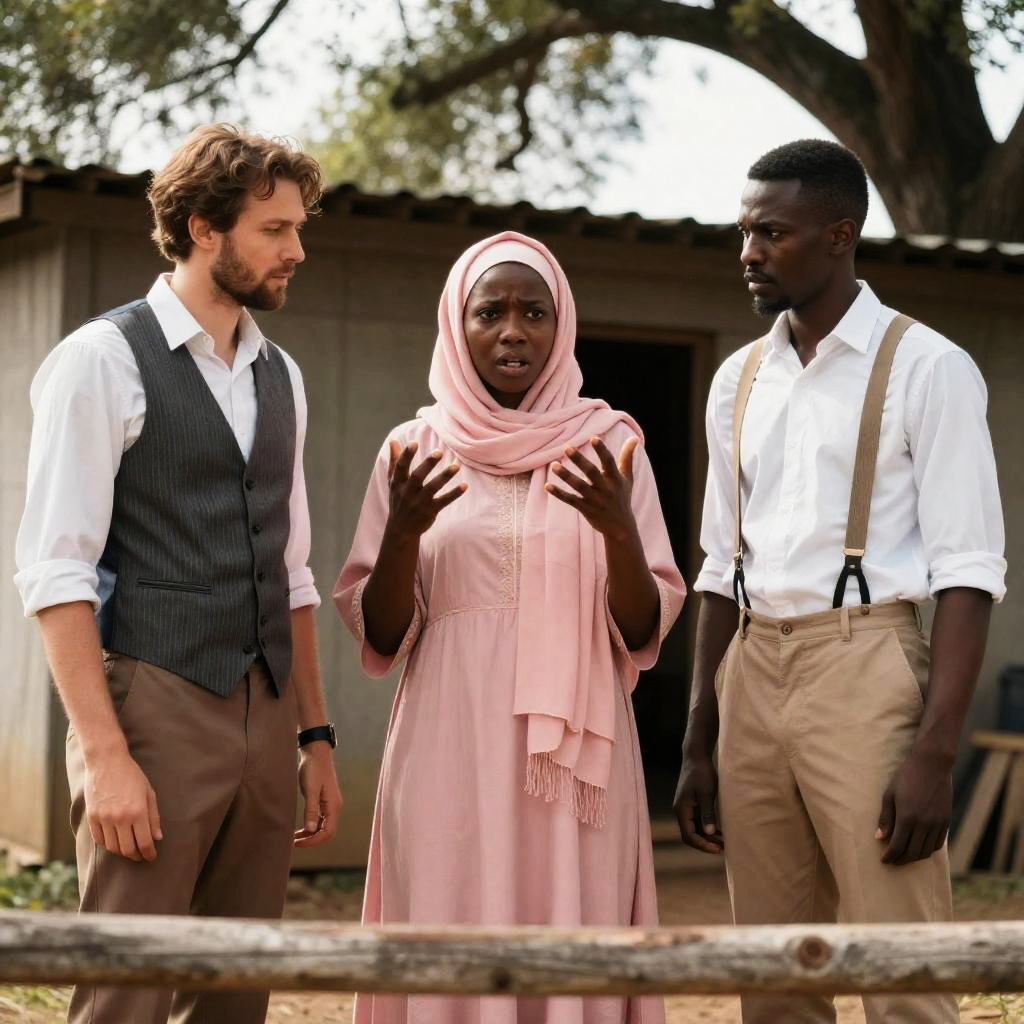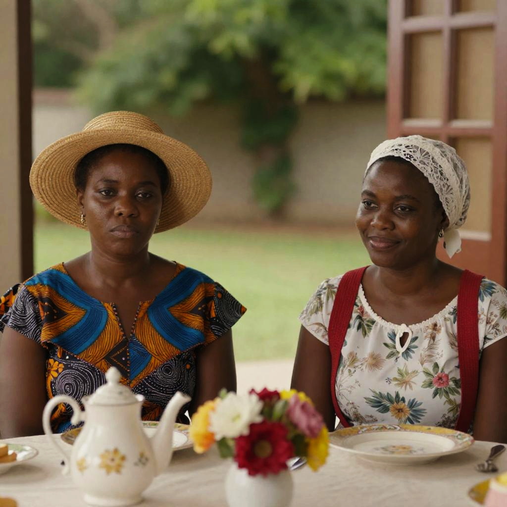 Photograph of two Black women sitting at a table. The woman on the left wears a straw hat and patterned blouse, looking serious. The woman on the right wears a lace headscarf and floral blouse with red suspenders, smiling. Table has a teapot, flowers, and dishes. Background: greenery through an open window. Both women are on the left and right, respectively.