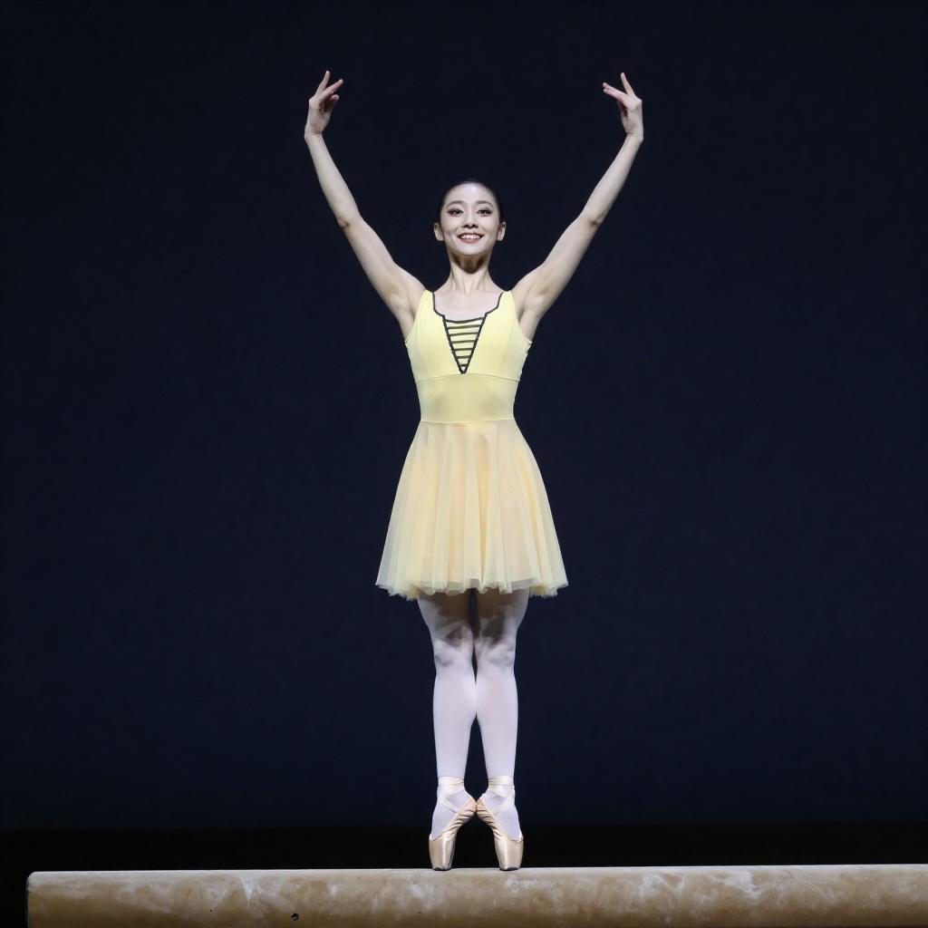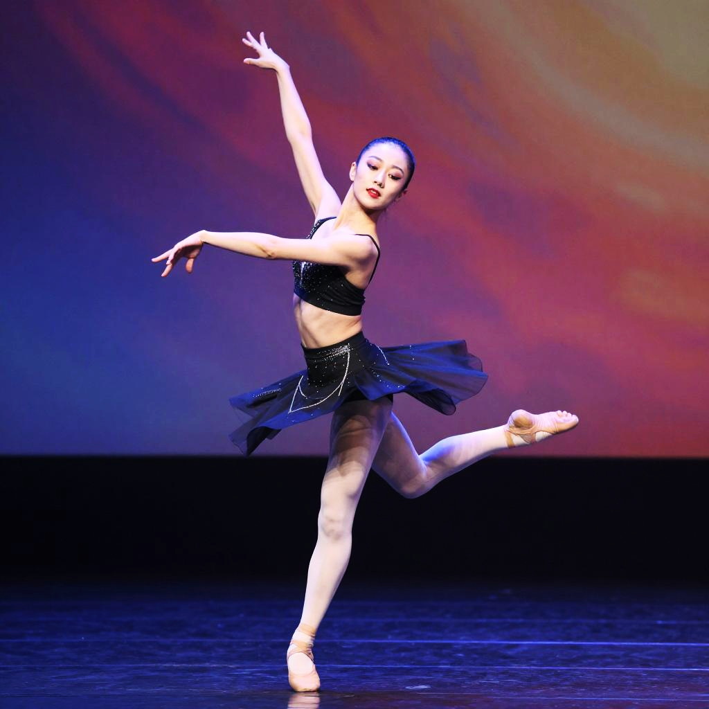 Asian female ballet dancer performing a dynamic, graceful pose on stage. She is dressed in a black sequined crop top and matching tutu skirt with ballet pointe shoes. The background features a vibrant, colorful gradient, highlighting the fluidity and strength of her movement during a dance performance.
