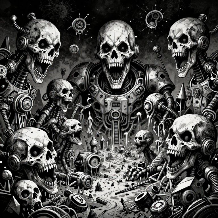 This is a digital black-and-white illustration featuring a chaotic scene of six robotic skulls with mechanical joints, wires, and gears. The central skull, larger and more prominent, has a wide-open mouth revealing sharp teeth. Surrounding it are five smaller skulls, also with open mouths, creating a sense of eerie, mechanical chaos. The background is dark with scattered bubbles and stars, adding to the surreal atmosphere. The central skull has a circular device on its chest, while the others have various mechanical details. The foreground is cluttered with more skulls, gears, and wires, creating a dense, detailed composition. The overall style is high-contrast and highly detailed, evoking a cyberpunk or steampunk aesthetic.