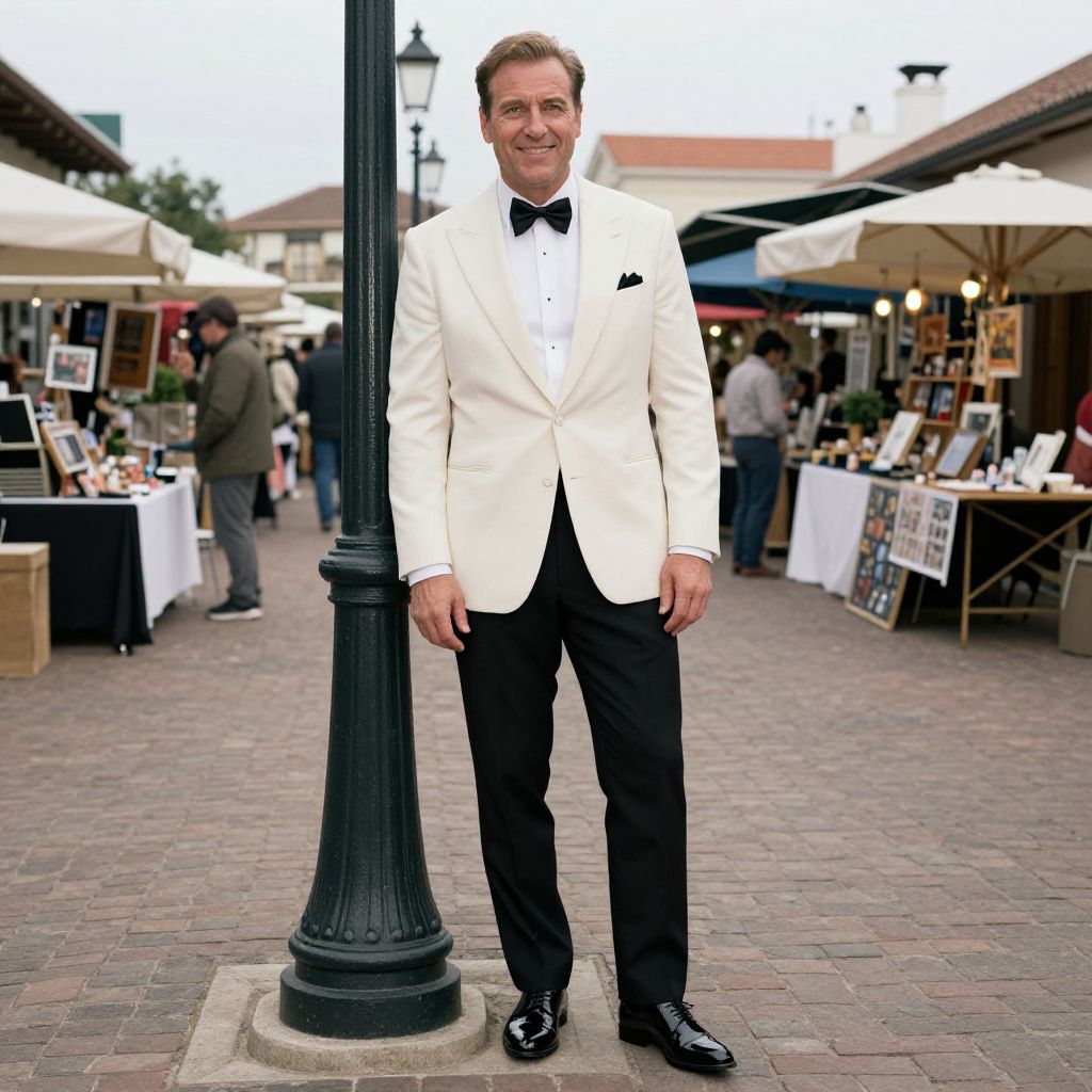 Photograph of a middle-aged Caucasian man with short, light brown hair, standing outdoors on a cobblestone street. He wears a white tuxedo jacket with black lapels, a black bow tie, white dress shirt, and black dress pants. His black patent leather shoes are polished. He is smiling slightly, leaning casually against a black, ornate lamppost. The background features an outdoor market with white umbrellas, tables displaying art and books, and a few other people in casual attire. The sky is overcast, and the market has a festive, yet relaxed atmosphere.