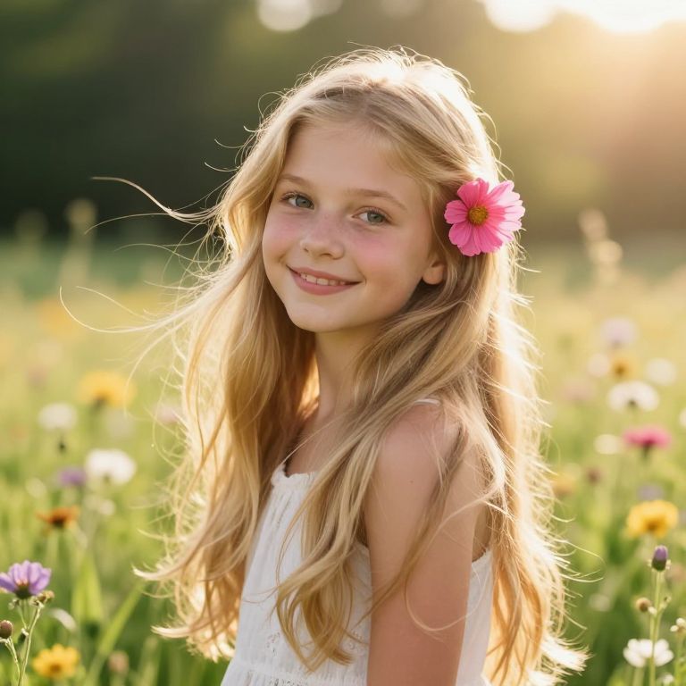 A beautiful young girl with long, flowing blonde hair, gently blowing in the wind, wearing a soft, flowing white dress with delicate lace details. She has warm, expressive eyes and a serene, joyful expression. A single white flower, a fresh rose, is gently nestled in her hair, adding a touch of elegance and natural charm. The background is a sunny meadow with soft green grass and blooming wildflowers, bathed in golden afternoon light, creating a peaceful and inviting atmosphere.