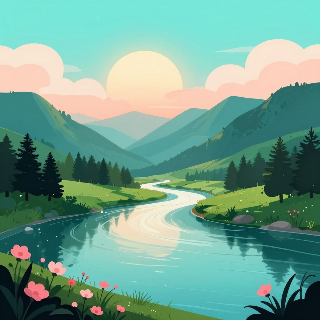 Retro-style minimalist illustration of the Tatra Mountains at sunset featuring three mountain peaks with snow caps. The scene includes a winding river in the foreground and evergreen trees scattered throughout. The artwork uses a warm color palette of burnt orange, deep red, yellow, and light vintage blue, inspired by the style of Frida Kahlo.