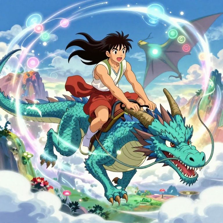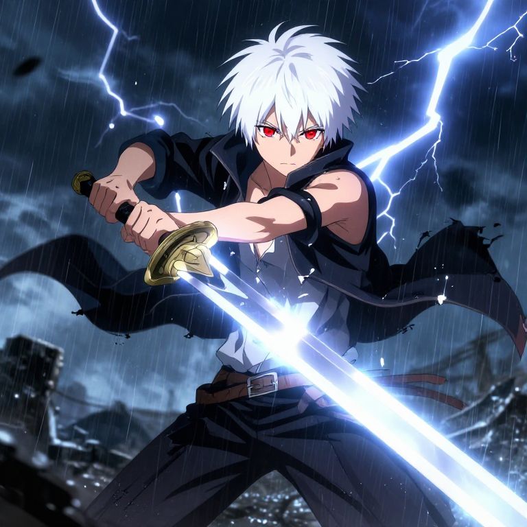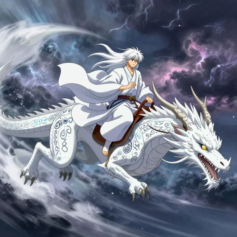 Anime guy with long white hair riding a white dragon through stormy skies, flowing robes billowing, ancient runes glowing on the dragon's scales, epic fantasy scene with dynamic motion and vibrant storm clouds.