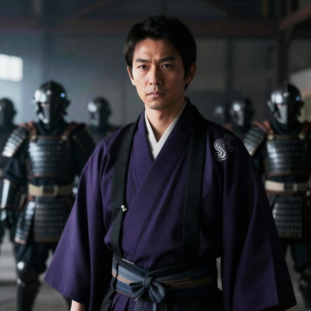 Photograph of a man with dark, wavy hair, wearing elaborate, armored red and black shoulder pads. Blue, misty background. Leaf in foreground. Serious expression. Centered, looking forward. One person.