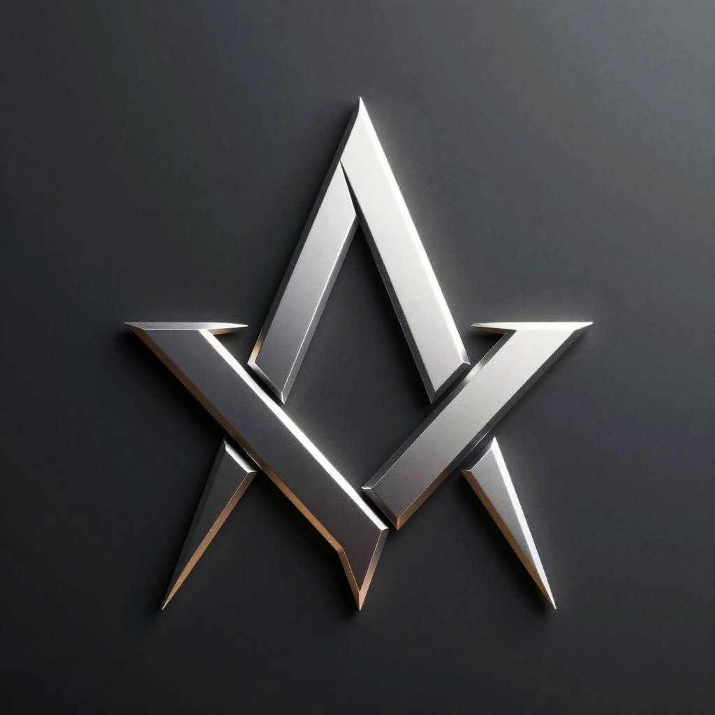 High resolution masonic logo, modern minimalist interpretation, sleek metallic finish, reflective surfaces, dark gradient backdrop, sharp shadows, professional vibrant design