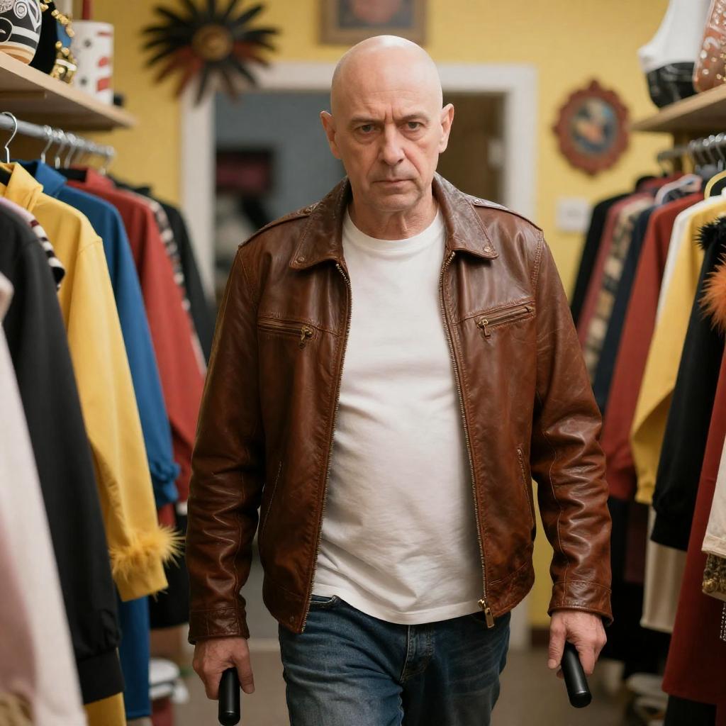 Photograph of a bald middle-aged man with a beard, wearing a brown sweater, dark coat, and carrying a gray bag. He stands in front of a black SUV with "LOSER" in pink letters. Forested background. Intense side-eye expression. One person.
