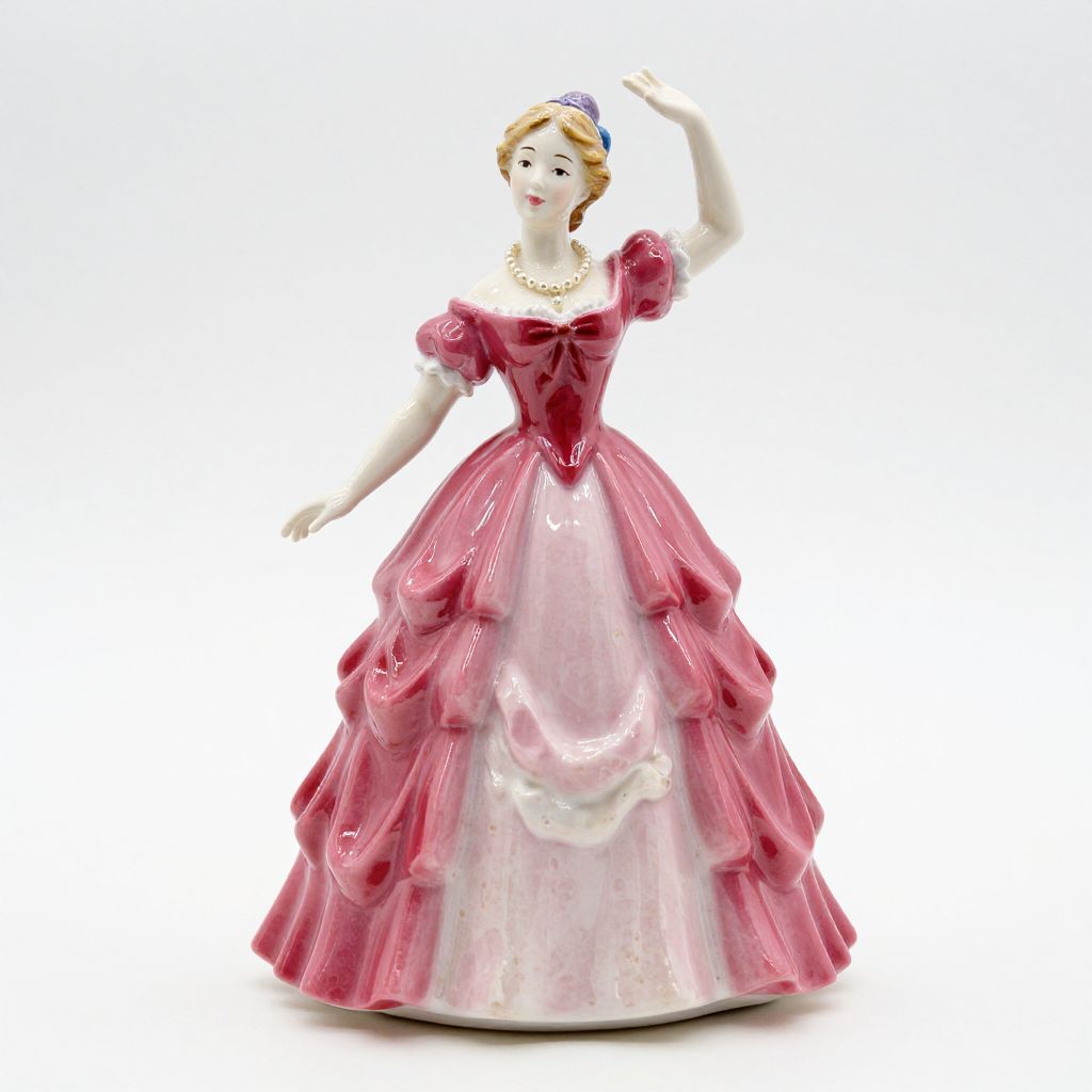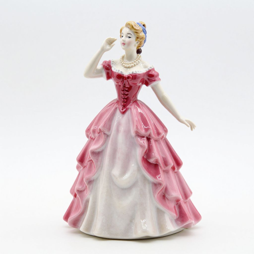 Elegant Royal Doulton figurine showcasing a woman in a vibrant pink gown with ruffled skirt, featuring a red bodice and pearl necklace, gracefully posed against a pristine white background.