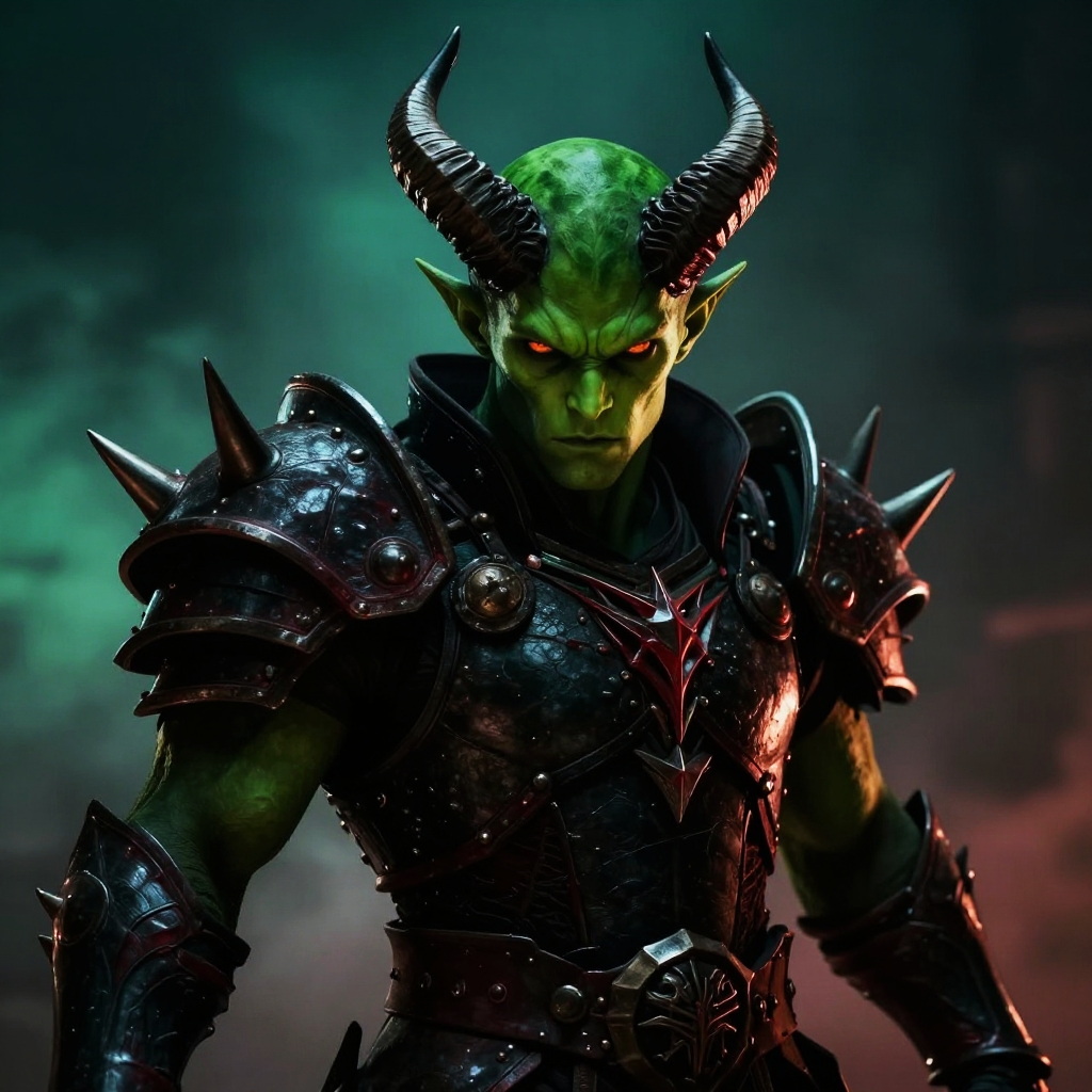 A fierce, fantasy-inspired character with striking green skin and sharp horns stands at the forefront. Clad in dark armor adorned with spikes and red accents, the character's piercing eyes convey a sense of strength and determination, surrounded by an atmospheric background that enhances the intense mood of the image.