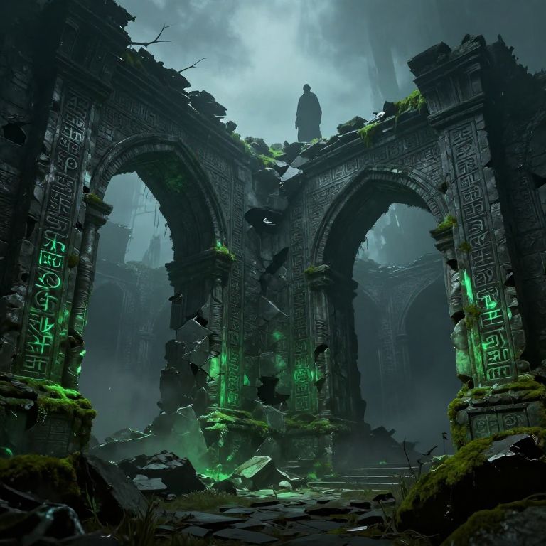 Digital artwork of a dark, ancient ruin with glowing green runes, moss-covered arches, and a lone figure standing atop the arches in misty
