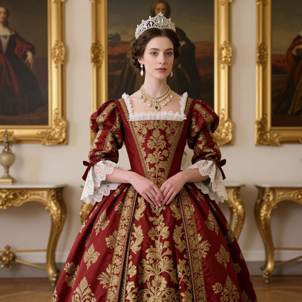 Photograph of a young woman with pale skin and dark brown, wavy hair wearing a silver tiara, a rich, red and gold brocade gown with puffed sleeves, white lace trim, and black ribbon bows. She stands in an opulent room with golden-framed paintings on the walls and ornate gold side tables. Her hands are delicately clasped in front of her, and she wears a gold necklace with a green gemstone pendant. The gown's intricate floral patterns and the room's classical decor evoke a regal, historical ambiance.