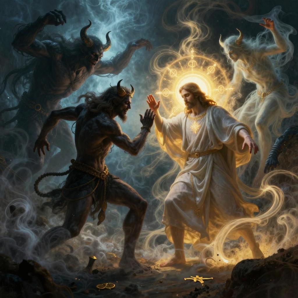 Jesus fighting demons amid a fiery hellscape, powerful and serene expression, glowing aura illuminating twisted, shadowy demons, detailed dark fantasy environment, vibrant reds and oranges contrasting with divine white light, cinematic atmosphere.