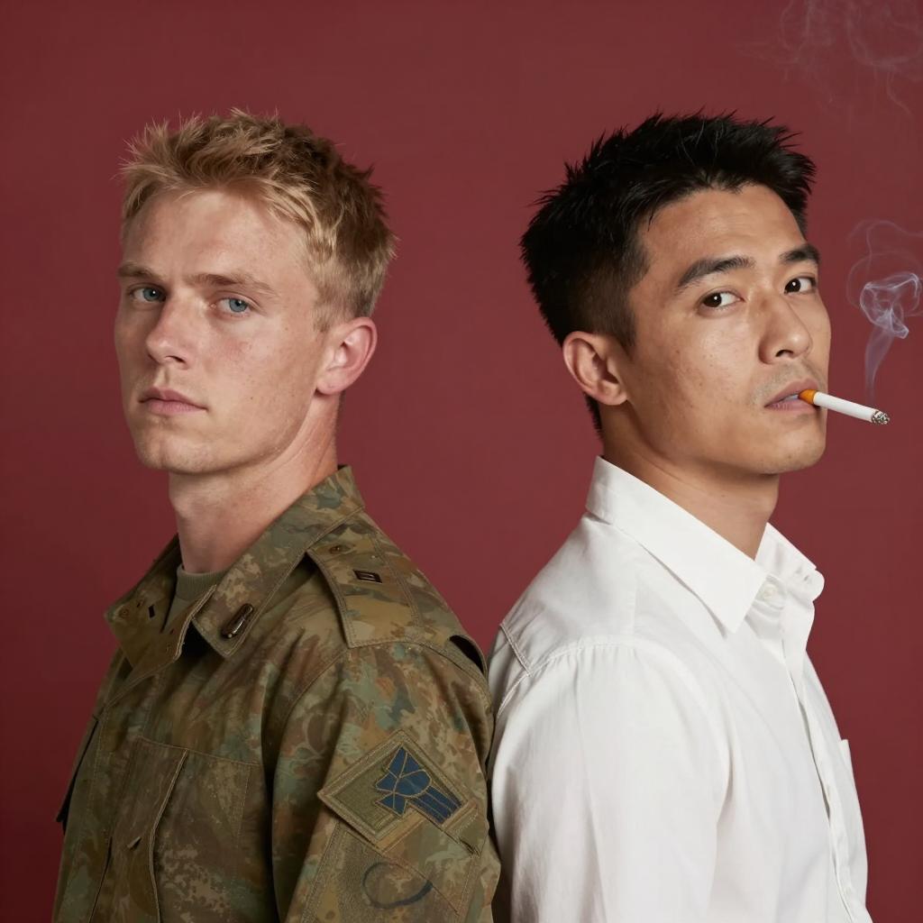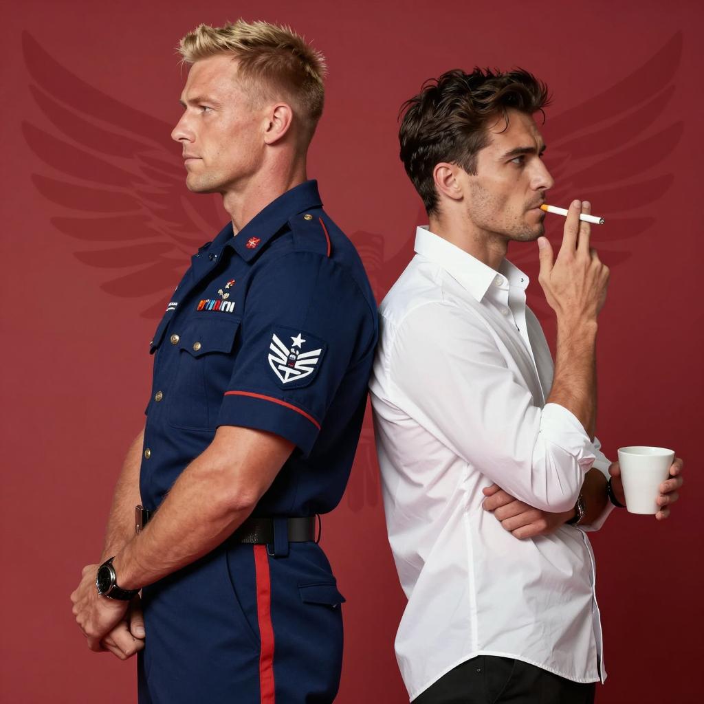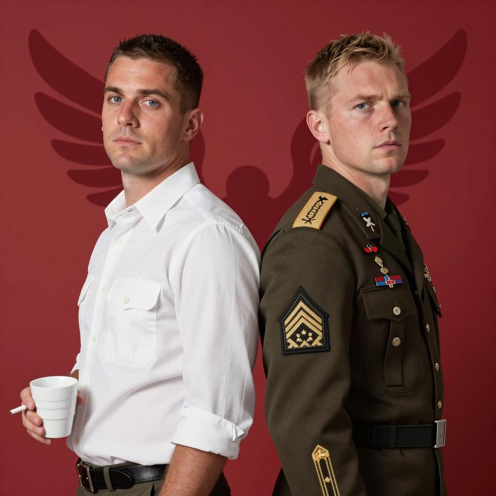 Photograph of two men against divided background. Left: African American man in military uniform, medals, serious expression, blue background with stars. Right: Blonde man with styled hair, open shirt, stern expression, red background with hammer and sickle. Split background, two men.