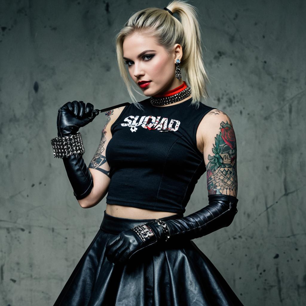 Outfit suicide squad,1girl, solo, gloves, tattoo, fingerless gloves, blonde hair, punk, red lips, choker, jewelry, skirt, black gloves, collar, makeup, arm tattoo, sleeveless, standing, ponytail, earrings, dress