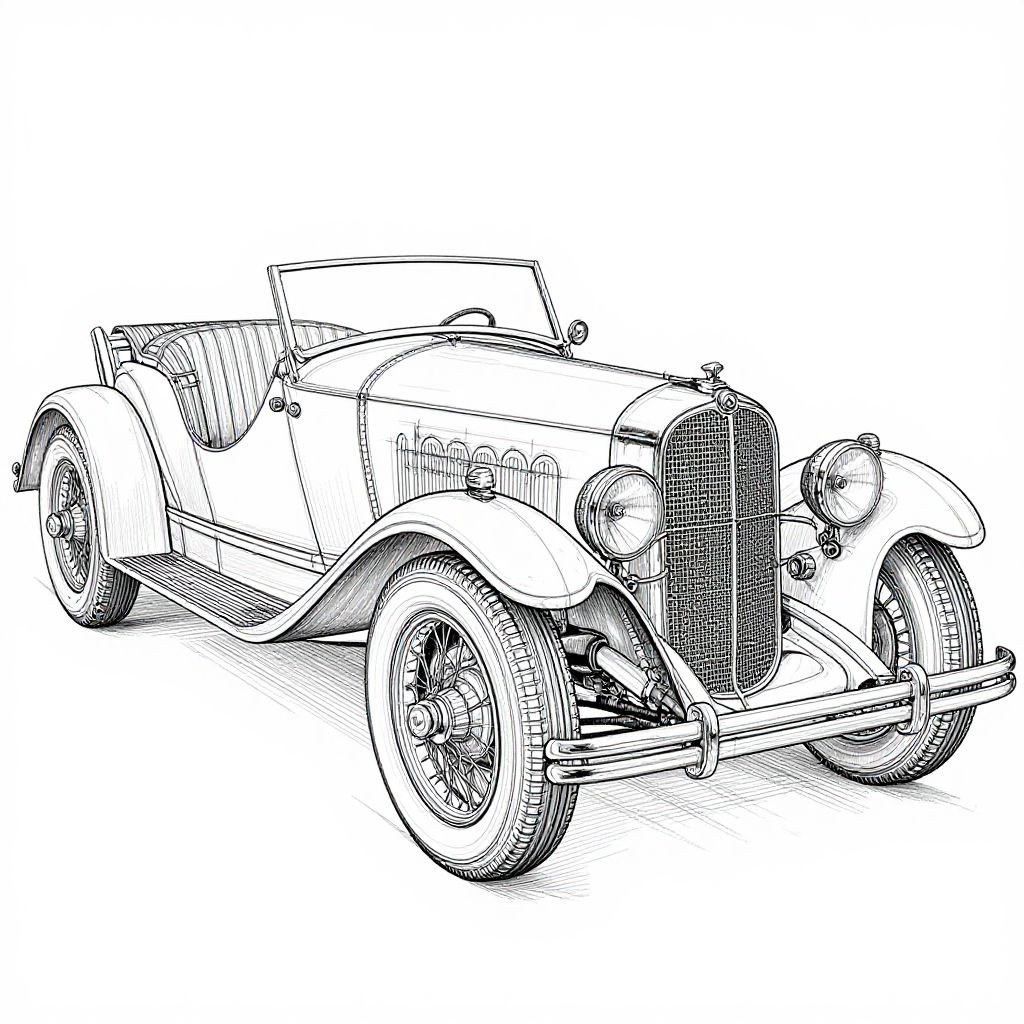 Black-and-white line drawing of a classic vintage convertible car with a large grille, fender-mounted headlights, and detailed wheel spokes.