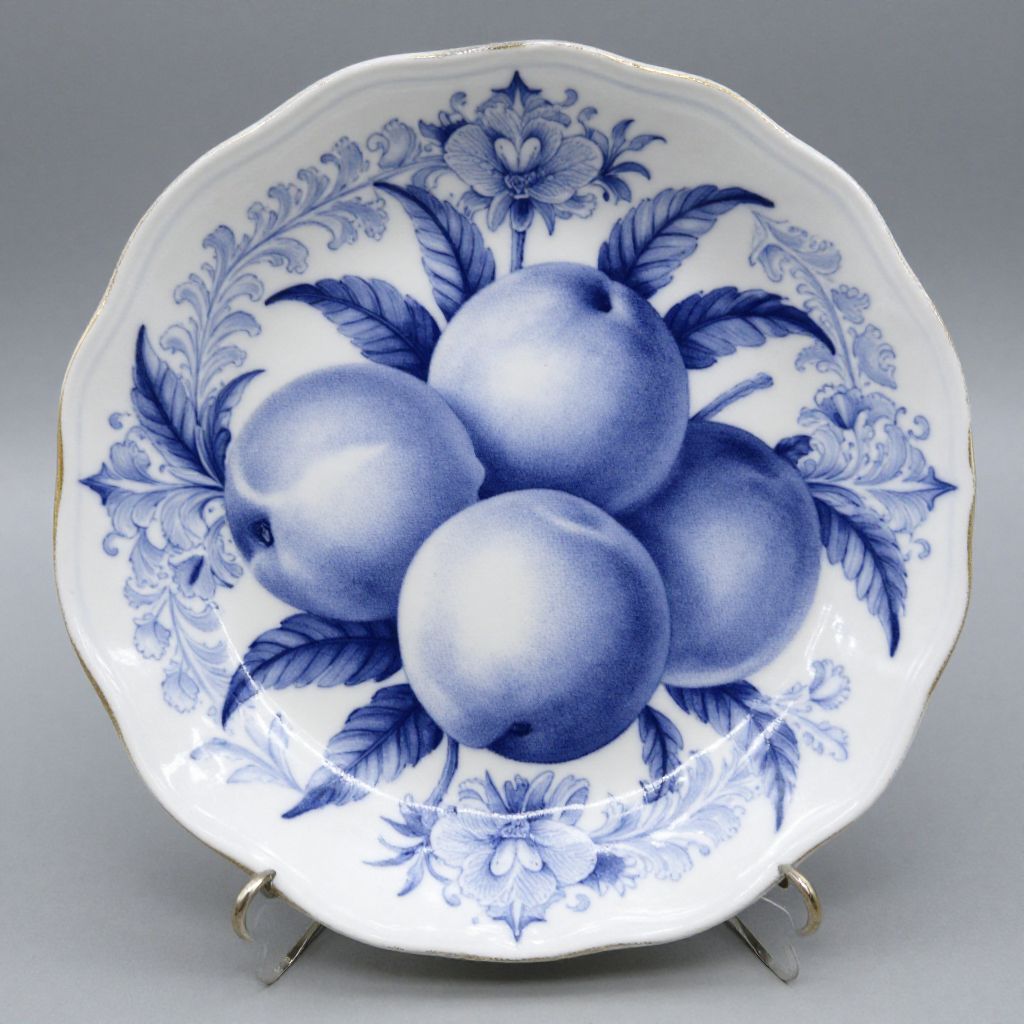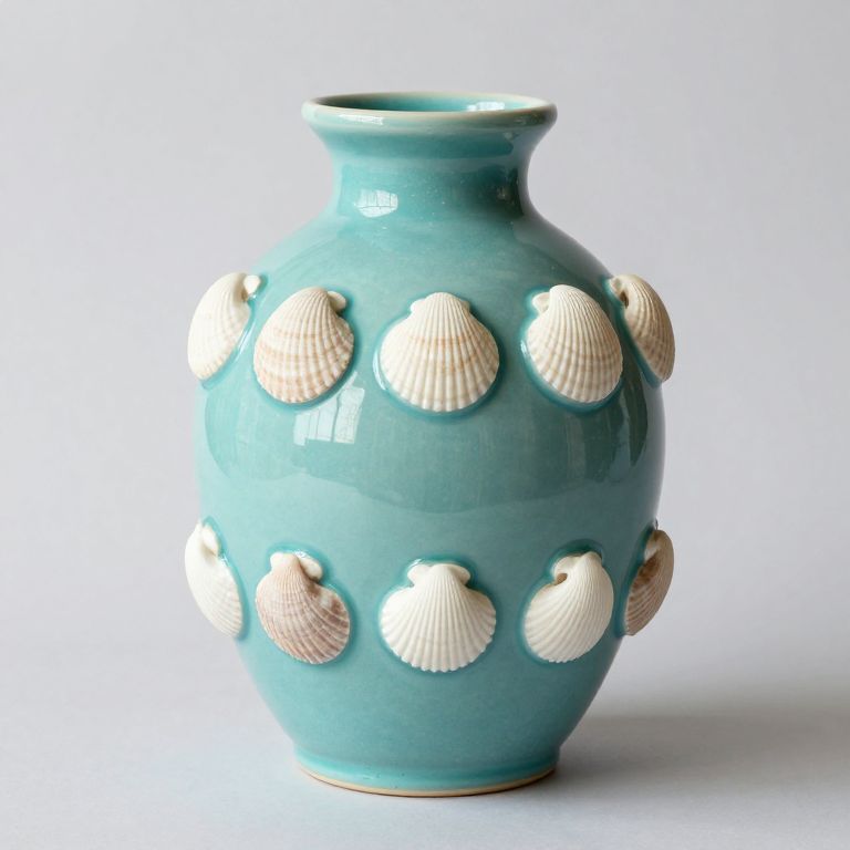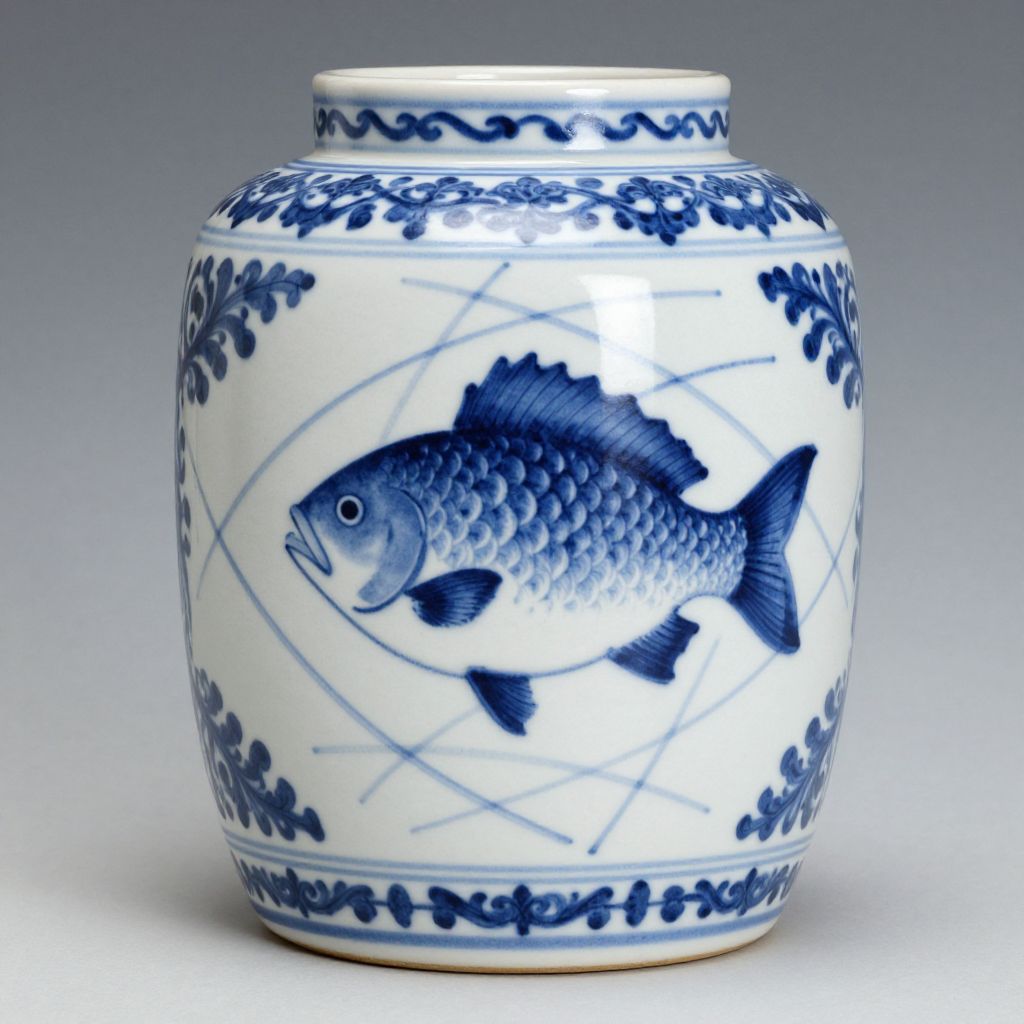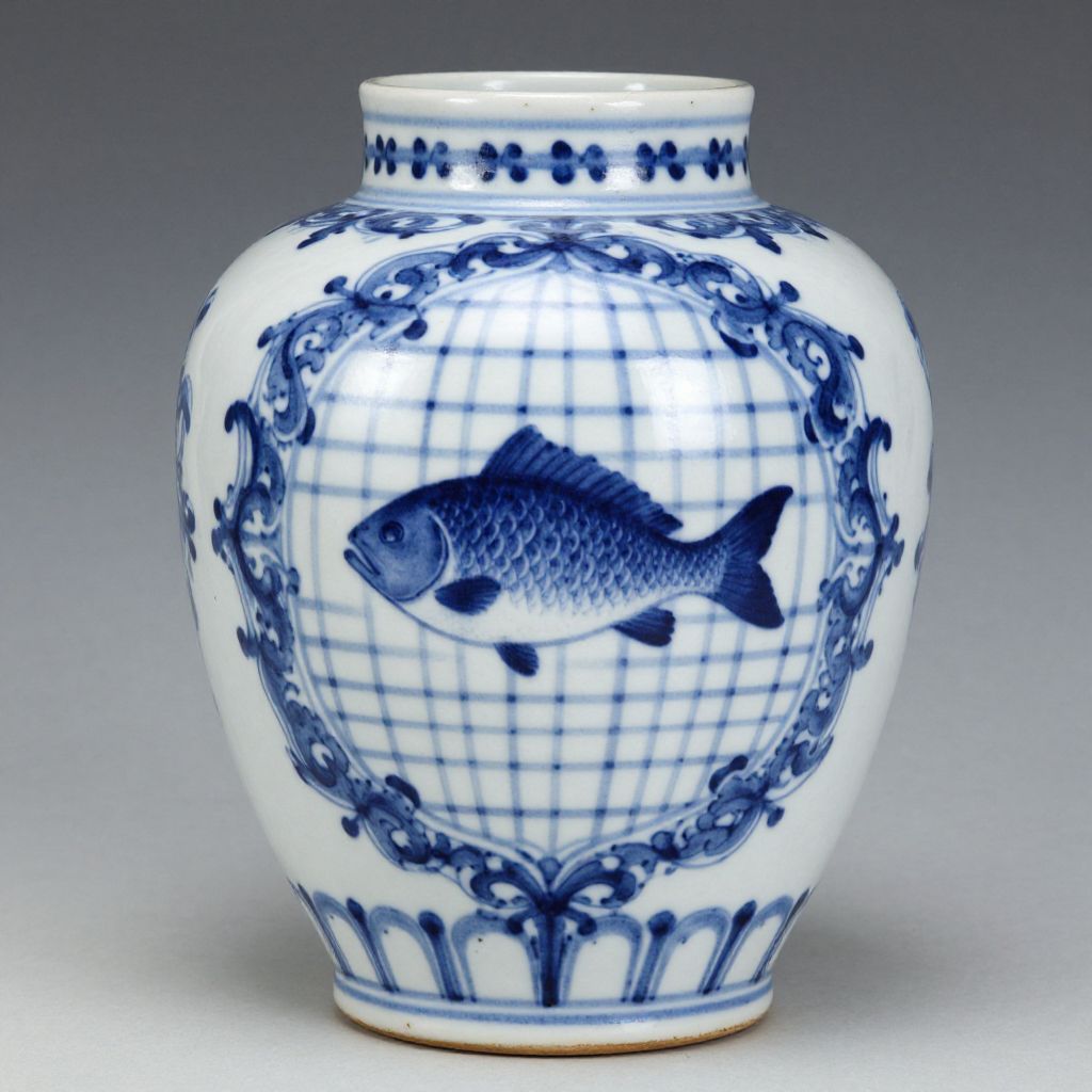 Photograph of a white ceramic vase with blue fish and grid pattern, surrounded by ornate blue floral designs, on a gradient gray background.