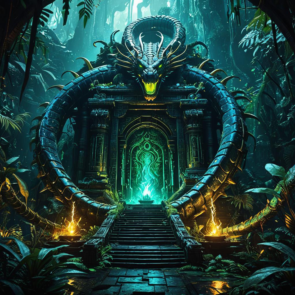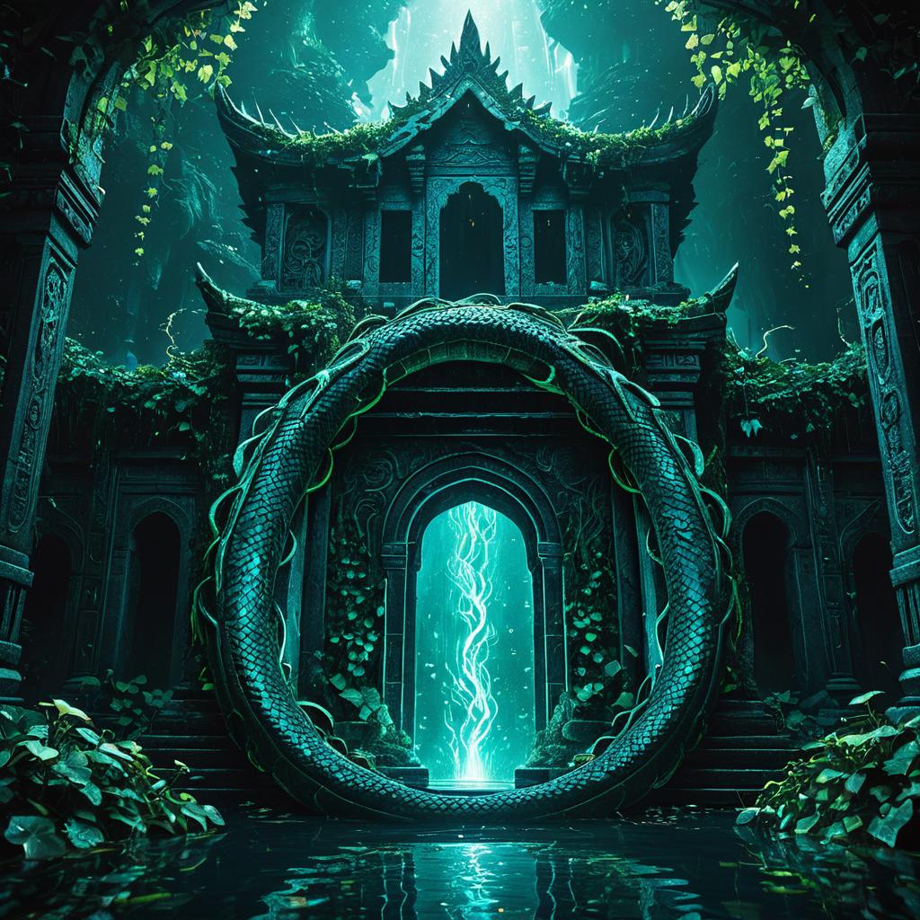 Ancient Flooded Temple with Bioluminescent Serpent Portal
