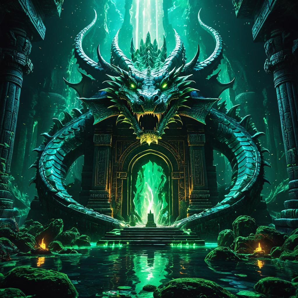 Stunning professional concept art of an ancient flooded temple covered in ivy with a gigantic bioluminescent serpent with translucent scales breathing ethereal teal flames, dark atmosphere, glowing blue-green hell portal, trending on ArtStation, ray tracing, highly detailed