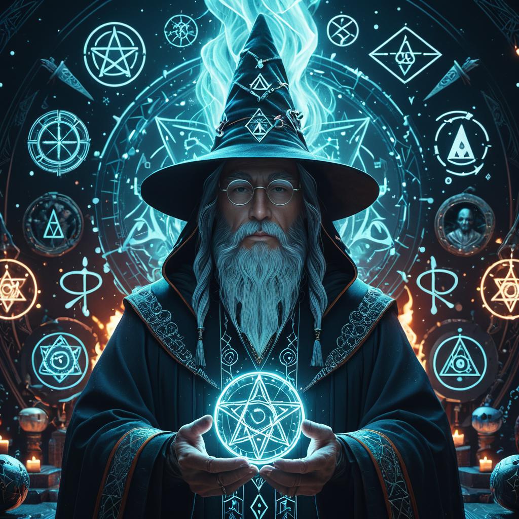Hyper-realistic portrait of an elderly wizard with a long white beard and round glasses, wearing a detailed dark robe and a pointed hat adorned with mystical symbols. He is holding a glowing magical orb with a pentagram and crescent moon, surrounded by various illuminated arcane symbols and candles, creating a cinematic and symmetrical fantasy scene.