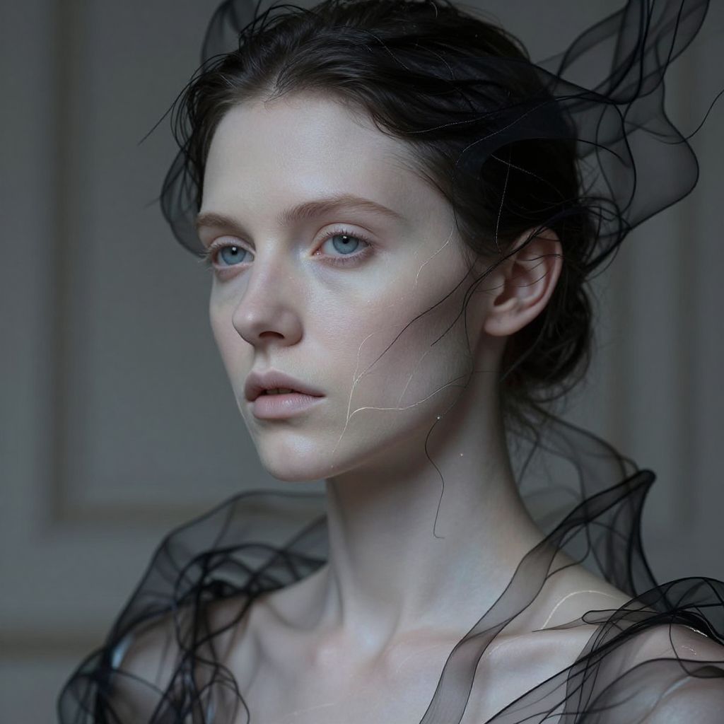 A digital photograph of a pale-skinned, blue-eyed woman with wet, dark brown hair. Black, semi-transparent, wispy threads are draped around her head and shoulders, giving a ghostly effect. She gazes to the side with a neutral expression. Her skin is smooth, with subtle light reflections. The background is blurred, featuring soft, muted gray tones and simple paneling. The overall mood is ethereal and somber, with a focus on her delicate features and the intricate, ghostly threads. The lighting is cool, emphasizing her blue eyes and pale complexion.