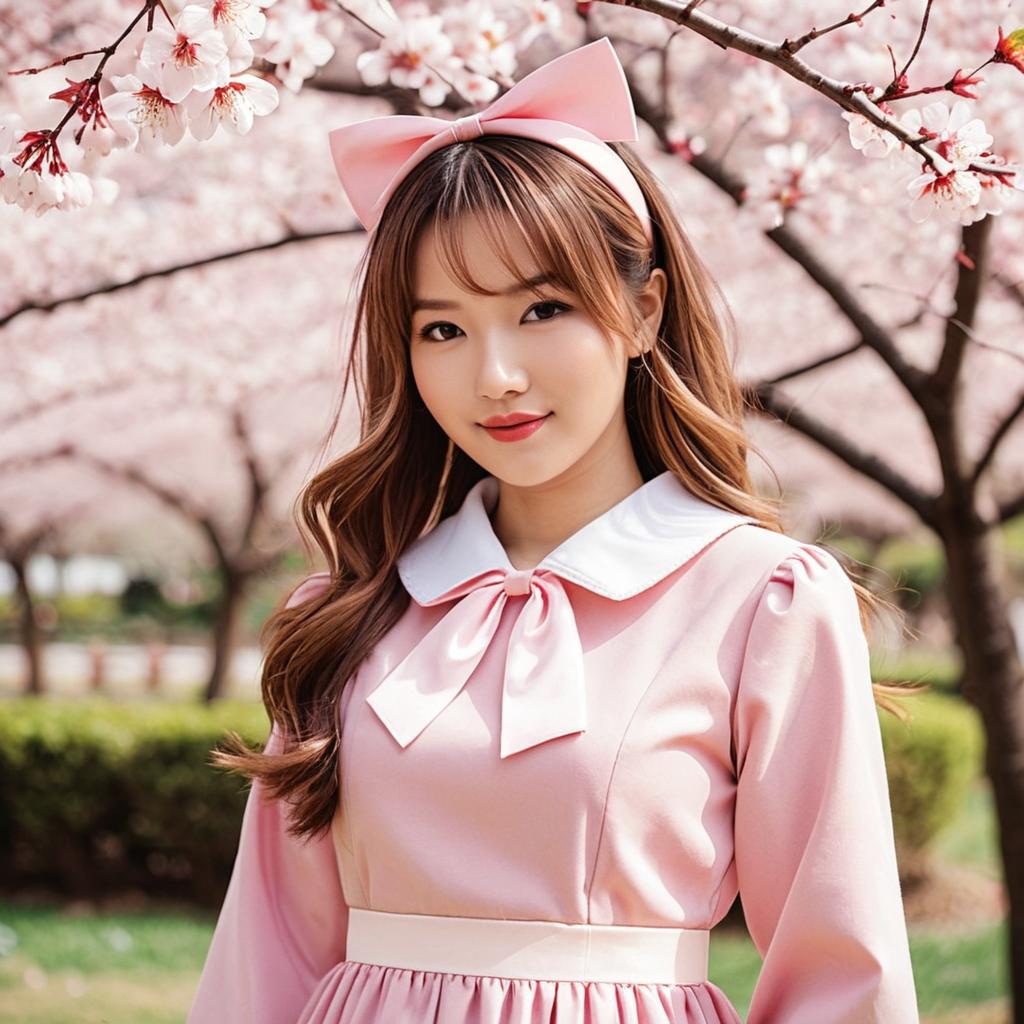 Portrait of a young Asian woman with light brown wavy hair wearing a pink long-sleeved dress with a white collar and matching pink bow, standing in a blooming cherry blossom garden. She has a pink headband with a bow, a gentle expression, and the background is softly blurred featuring pink cherry blossoms in daylight during springtime.