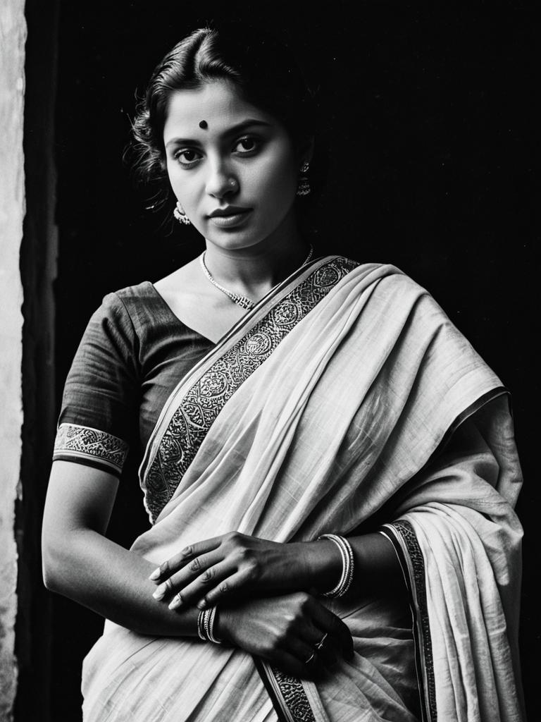Woman in Malmal Cotton Saree, cinematic realism, elegant dramatic portrait