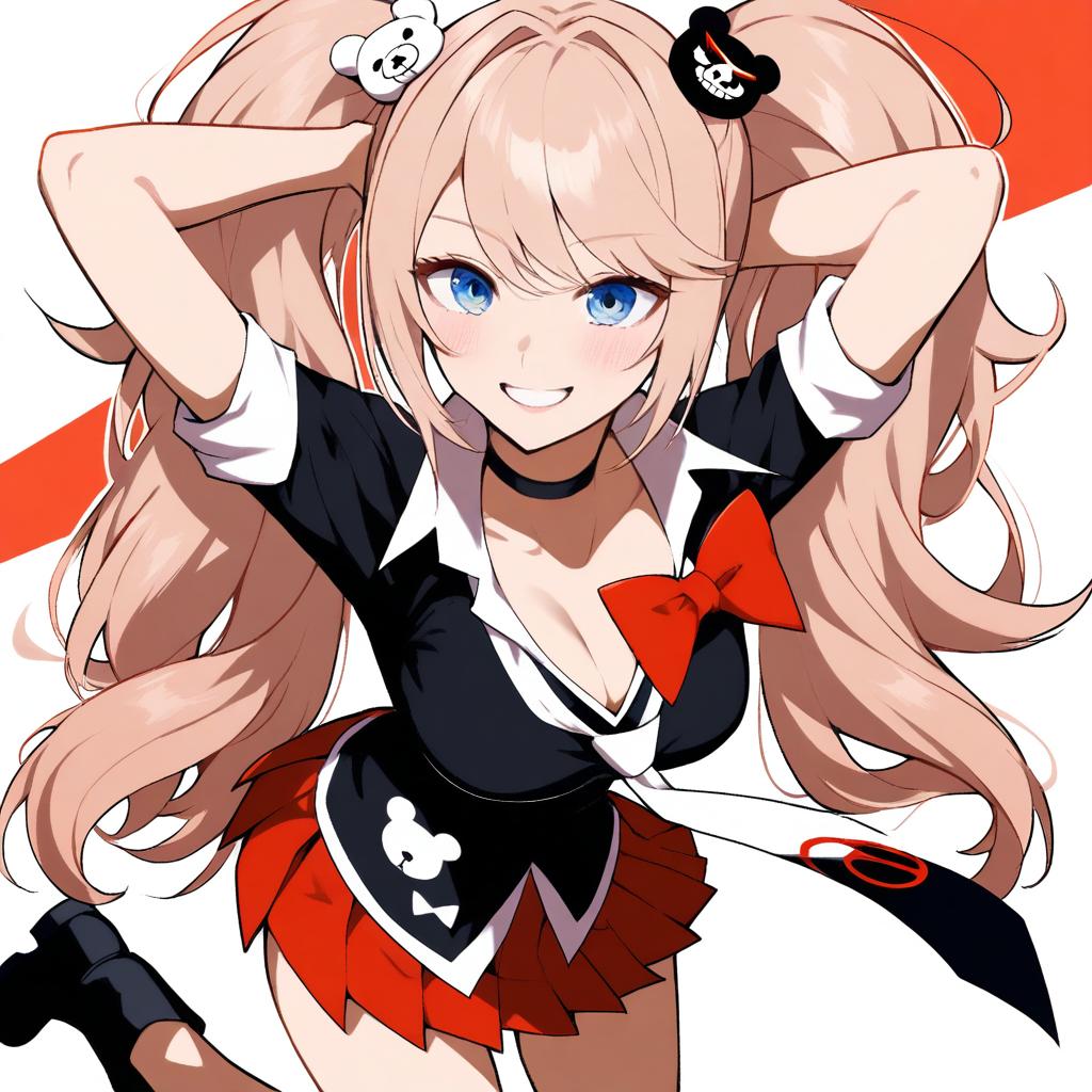 Swf, SFW, enoshima_junko,1girl,solo,skirt,red skirt,bear hair ornament,twintails,long hair,smile,hair ornament,blue eyes,black shirt,choker,shirt,necktie,grin,pleated skirt,bow,black footwear,miniskirt,black choker,red bow,n
